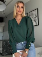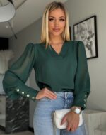 Bluzka ta została wykonana z wysokiej jakości materiału szyfonowego, który jest lekki, przewiewny i nadaje ubraniu wyjątkowego uroku. Szyfonowe rękawy dodają bluzce lekkości i delikatności, tworząc efekt unoszenia się materiału, co nadaje jej romantycznego charakteru.