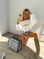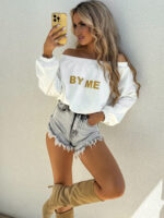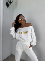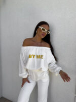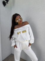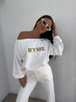 Luźna bluza z szerokim dekoltem typu „hiszpanka”, który opada na ramiona. Na przodzie znajduje się napis „BY ME”, wykonany dużymi literami. Rękawy są długie i zakończone elastycznymi ściągaczami.