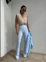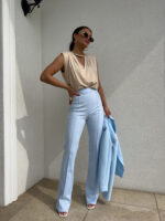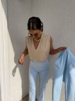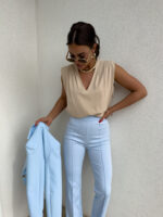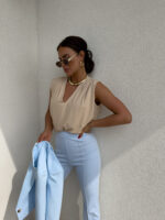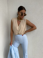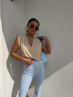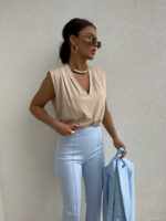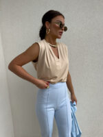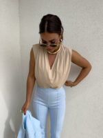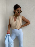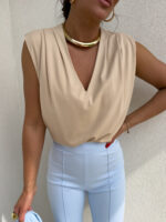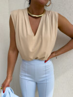 Stylowa bluzka wykonana z podwójnej warstwy przyjemnego w dotyku materiału to idealna propozycja na cieplejsze dni. Klasyczny dekolt w kształcie litery V subtelnie podkreśla szyję i obojczyki, dodając kobiecego uroku. Luźniejszy, delikatnie marszczony przód nadaje sylwetce lekkości i swobody, a brak rękawów sprawia, że model doskonale sprawdzi się zarówno w codziennych, jak i bardziej eleganckich stylizacjach.