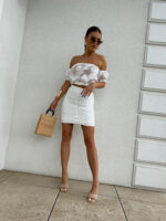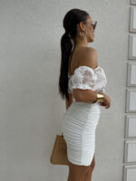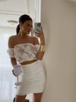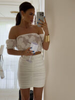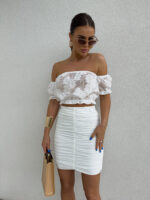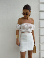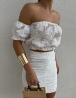 Ażurowa hiszpanka o krótkim kroju to doskonały wybór na ciepłe dni! Jej delikatny, przewiewny materiał sprawia, że jest lekka i komfortowa, idealnie komponując się ze spódnicami i spodniami. Góra bluzki jest wykończona wygodną gumką, która subtelnie dopasowuje się do ciała, zapewniając wygodę noszenia. Gumka przy rękawach dodaje całości uroku, tworząc efektowne, lekko bufiaste rękawy. To propozycja, która łączy elegancję z casualowym stylem, doskonale pasująca do wielu letnich stylizacji.