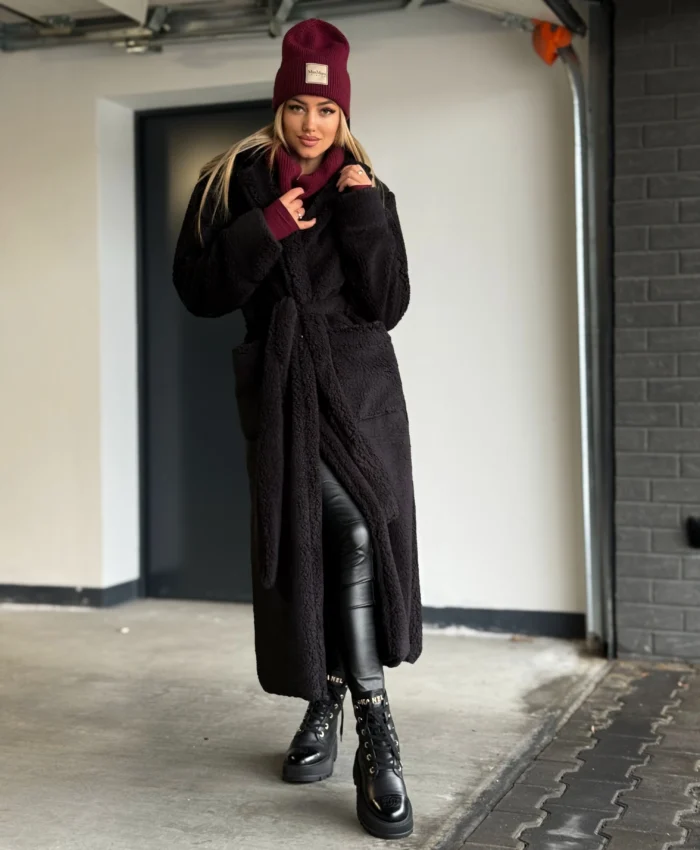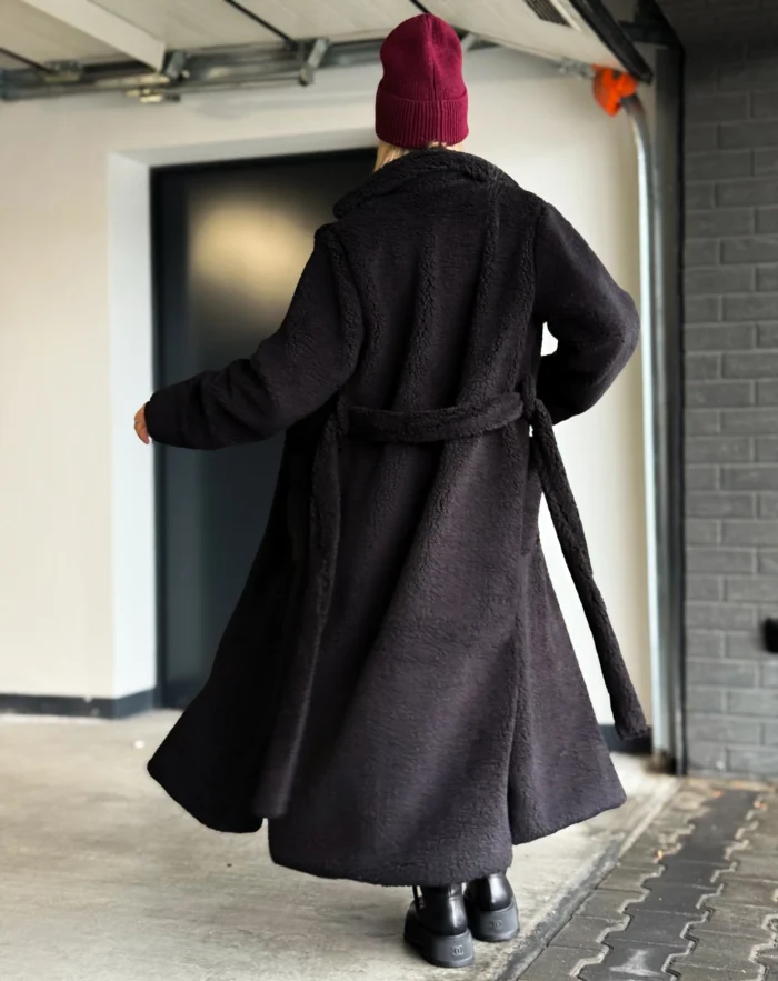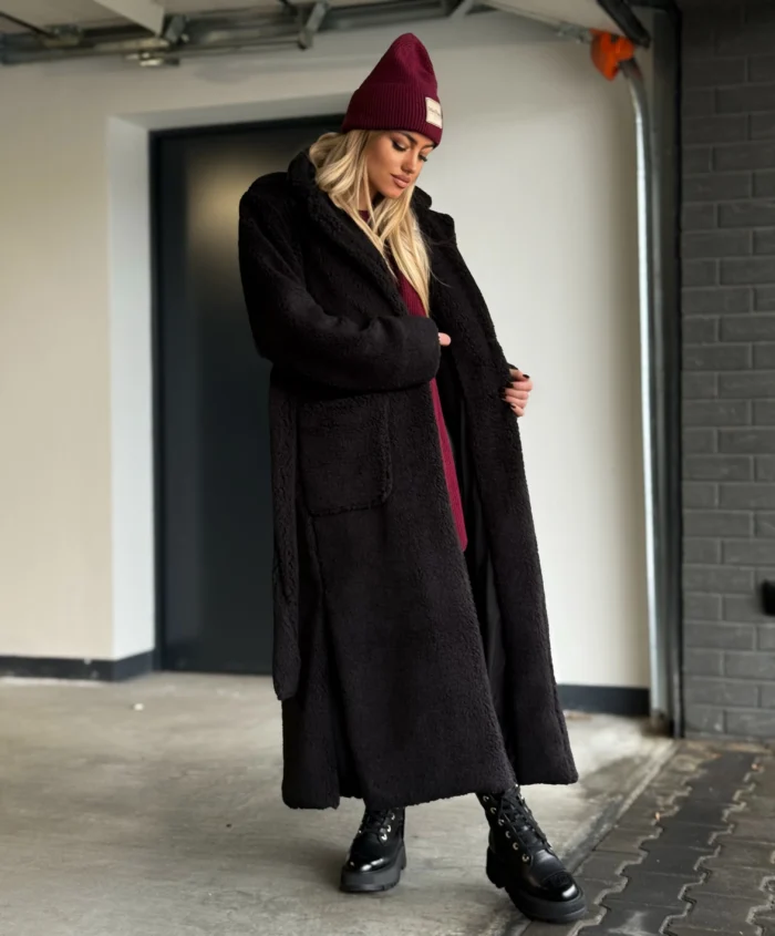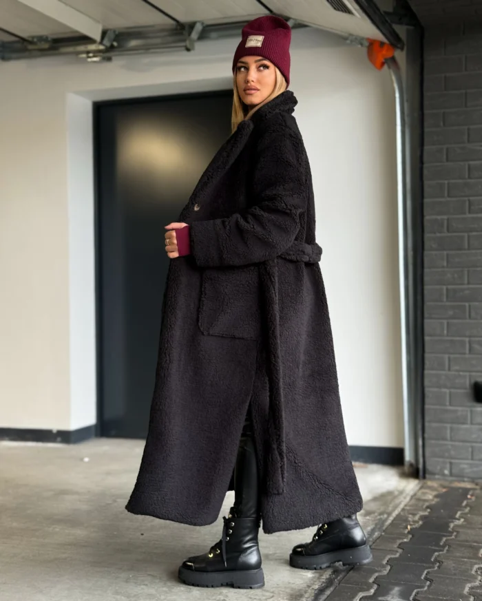 Długie, stylowe futro o eleganckim kroju. Model posiada obszerny kołnierz, który dodaje szyku i zapewnia dodatkowe ciepło. Zapinane na guziki, co nadaje mu minimalistyczny wygląd i ułatwia zakładanie. Boczne kieszenie zapewniają praktyczność, a gładka podszewka zwiększa komfort noszenia. Idealne jako uzupełnienie stylizacji na chłodniejsze dni.