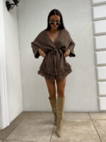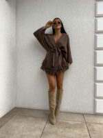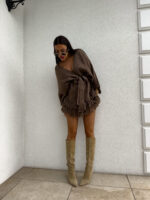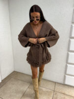 Podkreśl swój styl z kardiganem Oriana. Kardigan ma luźny, otwarty fason, a talię można podkreślić dołączonym paskiem, dzięki czemu sylwetka nabiera kobiecego kształtu. Dół kardiganu ozdobiony frędzlami, które nadają mu lekkości i boho charakteru.