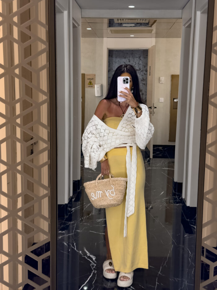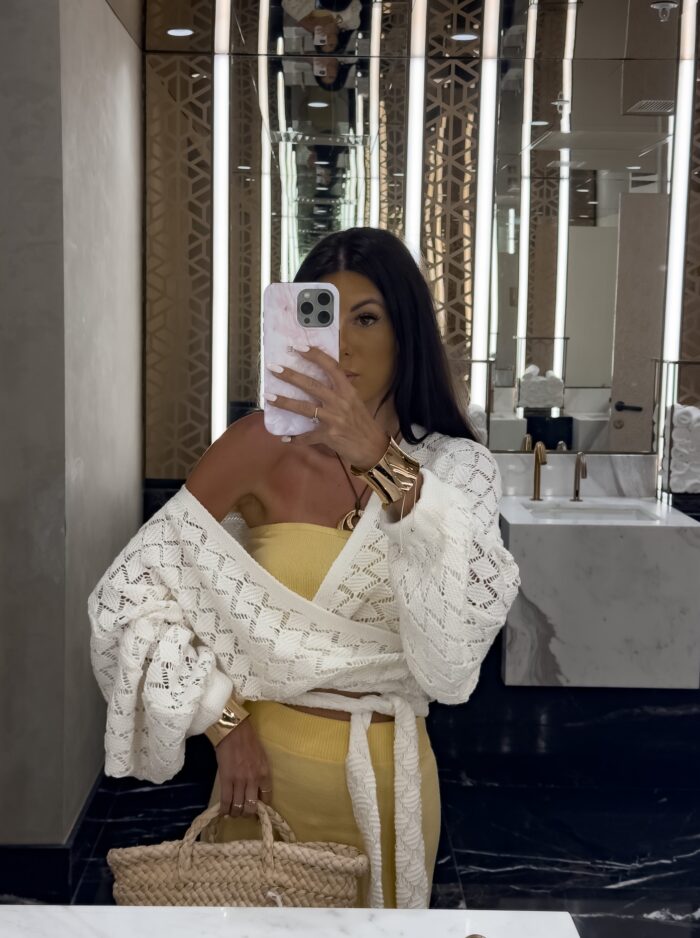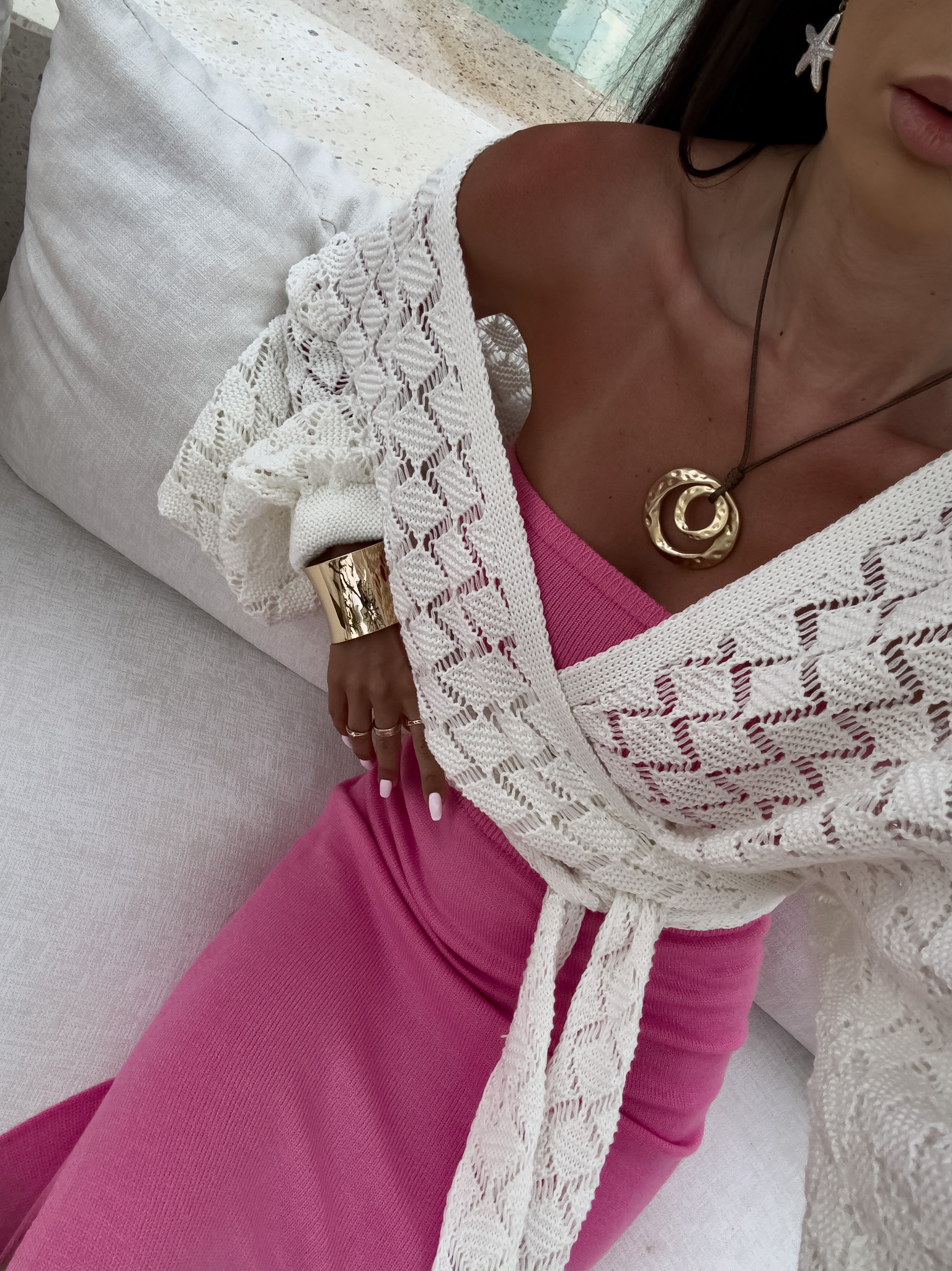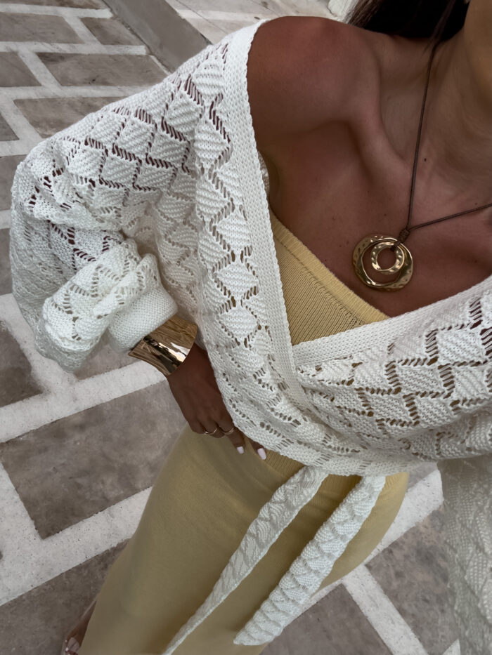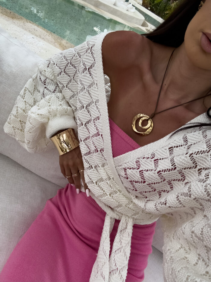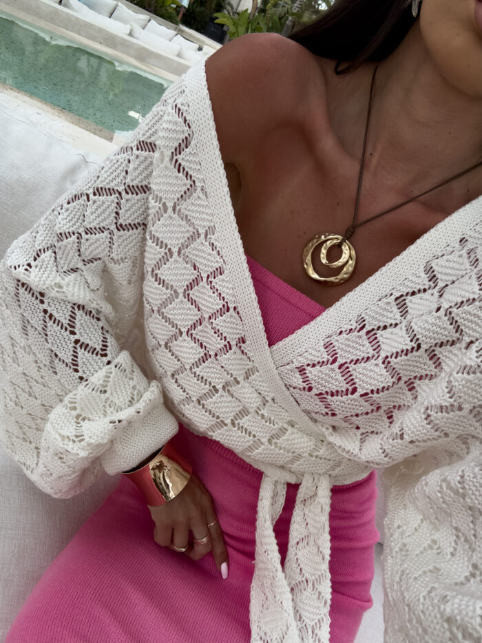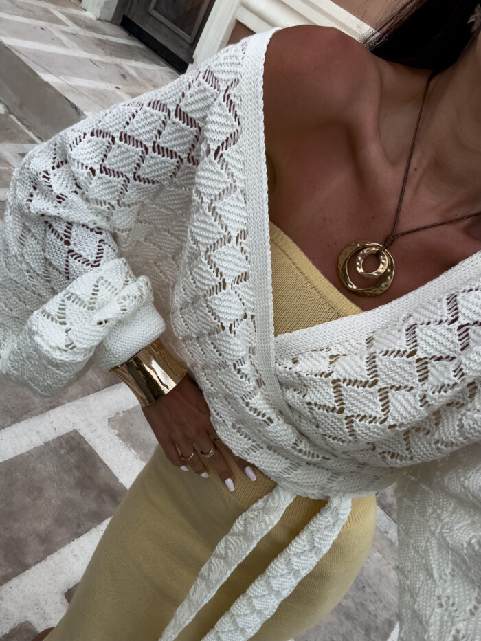 Kimono to stylowy i lekki element garderoby, który łączy w sobie elegancję z komfortem. Kimono jest przewiązywane, co pozwala na dopasowanie go do sylwetki oraz dodaje mu swobody w stylizacji. Można go nosić zarówno z przodu, jak i z tyłu, co daje szerokie możliwości noszenia i dostosowania do różnych stylizacji. Długi rękaw zakończony gumką sprawia, że kimono jest wygodne i dobrze trzyma się na ramionach, dodając całości eleganckiego wyglądu. Idealne do noszenia na co dzień lub na bardziej formalne okazje.