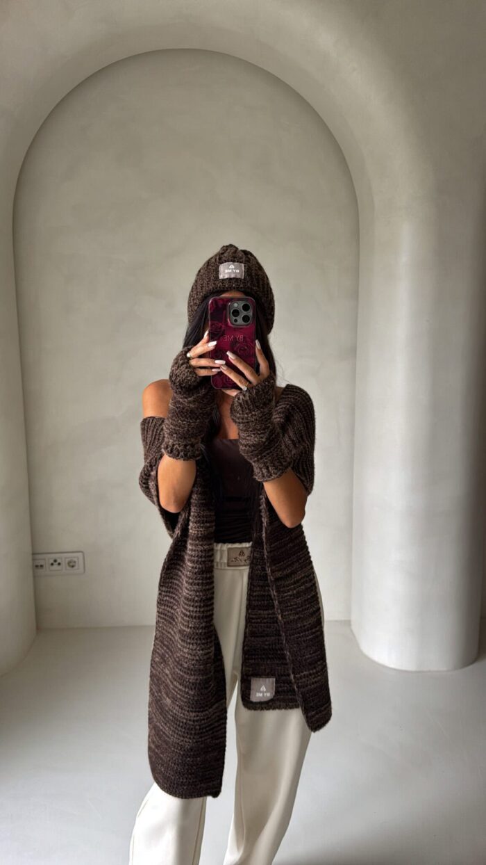 Komplet Alaska składający się z ciepłej czapki, szalika i rękawiczek bez palców.