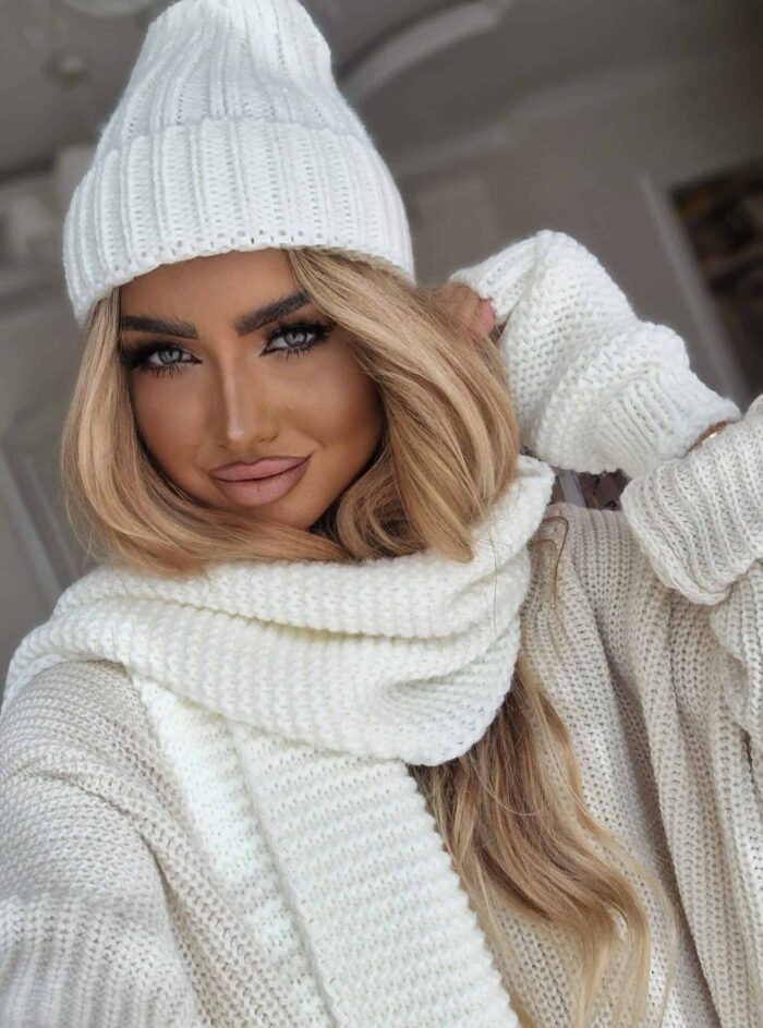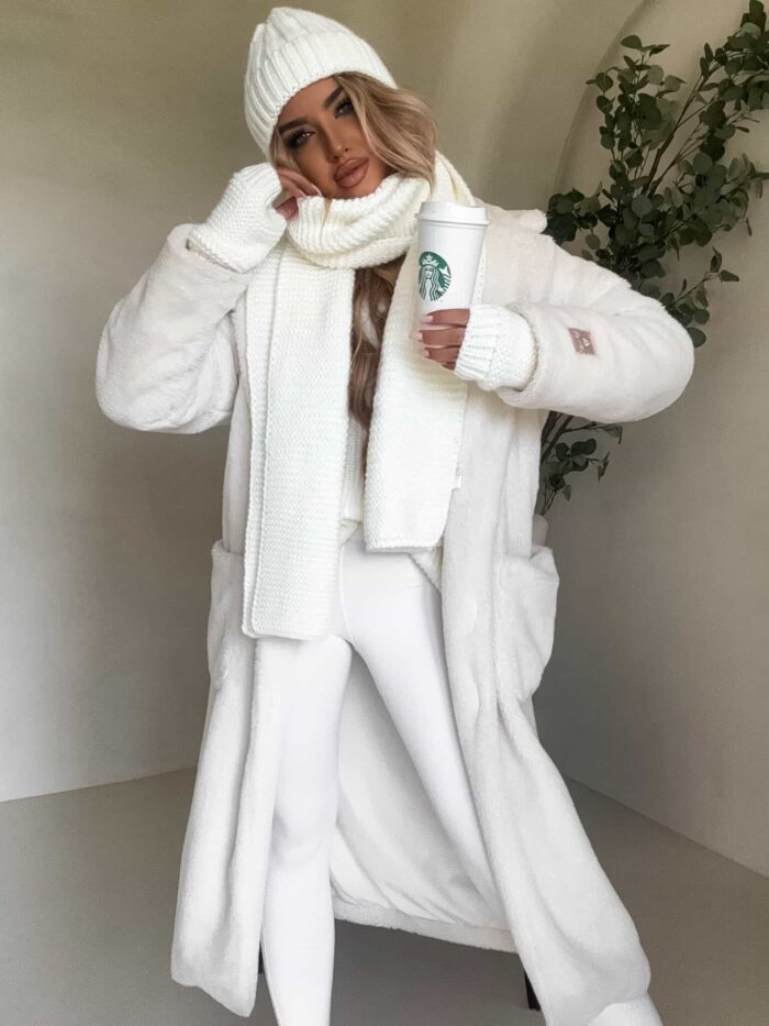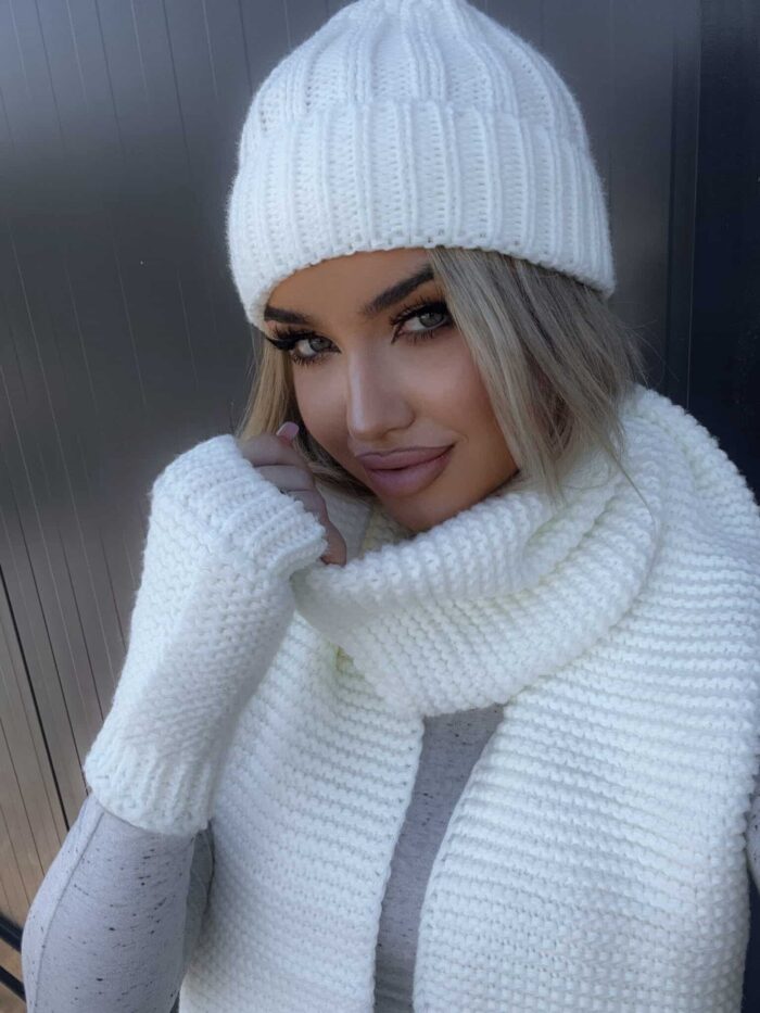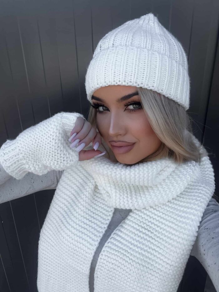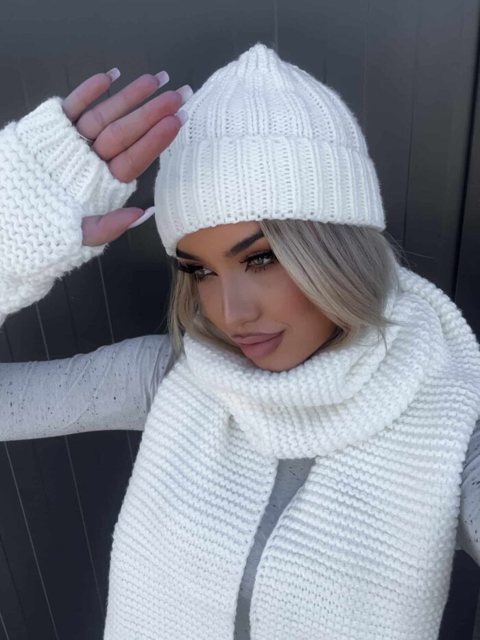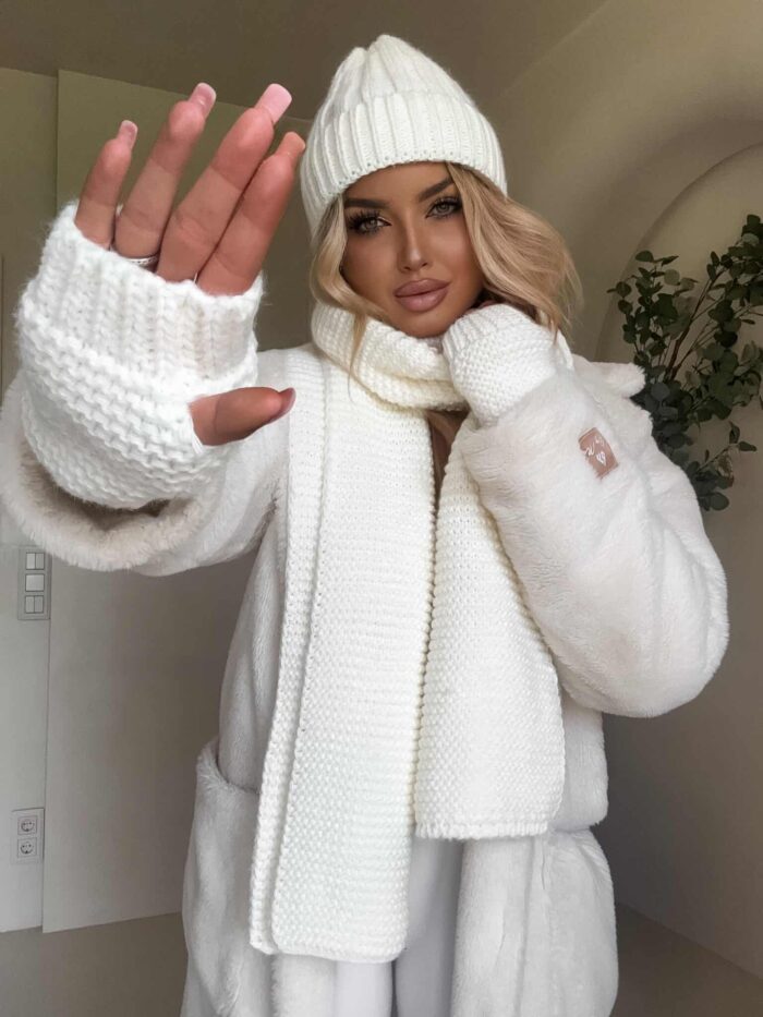 Komplet Alaska składający się z ciepłej czapki, szalika i rękawiczek bez palców.