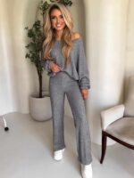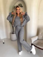 Komplet ANGEL wykonany z najwyższej jakości materiału, bardzo milutkiego. Bluza o prostym, luźnym kroju, z długim rękawem zakończonym gumą. Szerokie spodnie z gumką w pasie.