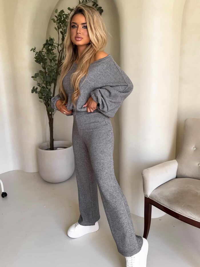 Komplet ANGEL wykonany z najwyższej jakości materiału, bardzo milutkiego. Bluza o prostym, luźnym kroju, z długim rękawem zakończonym gumą. Szerokie spodnie z gumką w pasie.