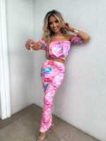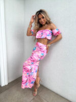 Komplet składający się z krótkiej bluzki hiszpanki oraz klasycznej spódnicy maxi to idealne połączenie elegancji i komfortu. Bluzka wykonana jest z elastycznego, ciągliwego materiału, który doskonale dopasowuje się do ciała, zapewniając swobodę ruchów. Krótki krój podkreśla sylwetkę. Spódnica maxi jest klasyczna, o długości do ziemi, z eleganckim rozcięciem z tyłu, które dodaje lekkości i zmysłowości. Gumka w pasie gwarantuje wygodę i perfekcyjne dopasowanie do figury. Całość stanowi doskonały wybór na letnie dni, na wyjątkowe okazje lub codzienne stylizacje z nutą elegancji.