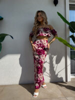 Komplet składający się z krótkiej bluzki hiszpanki oraz klasycznej spódnicy maxi to idealne połączenie elegancji i komfortu. Bluzka wykonana jest z elastycznego, ciągliwego materiału, który doskonale dopasowuje się do ciała, zapewniając swobodę ruchów. Krótki krój podkreśla sylwetkę. Spódnica maxi jest klasyczna, o długości do ziemi, z eleganckim rozcięciem z tyłu, które dodaje lekkości i zmysłowości. Gumka w pasie gwarantuje wygodę i perfekcyjne dopasowanie do figury. Całość stanowi doskonały wybór na letnie dni, na wyjątkowe okazje lub codzienne stylizacje z nutą elegancji.