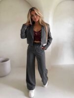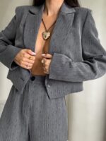 Ten wyjątkowy komplet to połączenie klasy i współczesnego charakteru. Marynarka – krótka o lekko oversize’owym kroju z podkreślonymi ramionami. Klasyczne klapy i zapięcie na jeden guzik podkreślają minimalistyczny styl. Spodnie wykonane z tego samego materiału, mają wysoki stan i szerokie, swobodnie układające się nogawki.