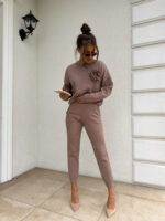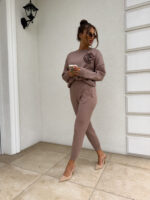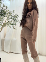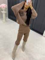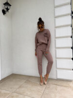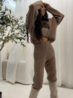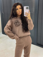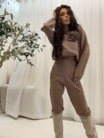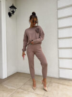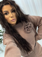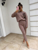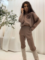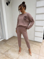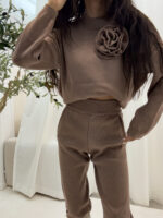 Komplet Delani Long składający się z bluzy sweterkowej z długim rękawem oraz długich spodni z gumką w pasie. Kwiat jest odpinany.