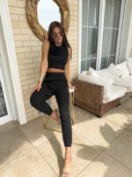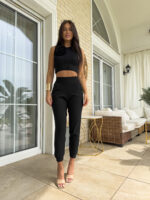 Stylowy komplet damski składający się z krótkiego topu bez rękawów oraz długich, wygodnych spodni z elastyczną gumką w pasie. Zestaw łączy w sobie komfort i modny wygląd – idealny zarówno na co dzień, jak i na specjalne okazje. Dodatkowym atutem jest dekoracyjny kwiat, który można dowolnie odpinać, dostosowując stylizację do własnych upodobań.