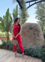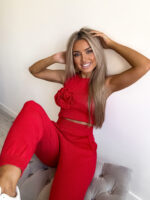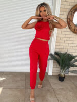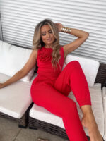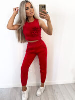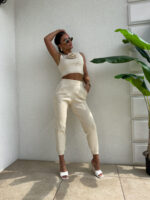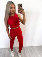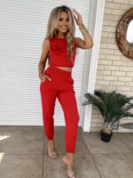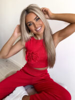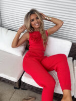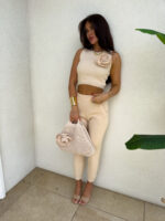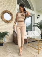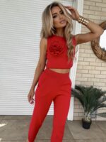 Stylowy komplet damski składający się z krótkiego topu bez rękawów oraz długich, wygodnych spodni z elastyczną gumką w pasie. Zestaw łączy w sobie komfort i modny wygląd – idealny zarówno na co dzień, jak i na specjalne okazje. Dodatkowym atutem jest dekoracyjny kwiat, który można dowolnie odpinać, dostosowując stylizację do własnych upodobań.