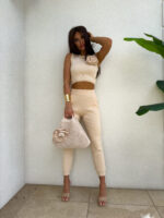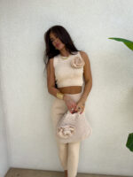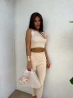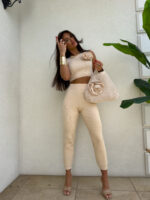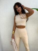 Stylowy komplet damski składający się z krótkiego topu bez rękawów oraz długich, wygodnych spodni z elastyczną gumką w pasie. Zestaw łączy w sobie komfort i modny wygląd – idealny zarówno na co dzień, jak i na specjalne okazje. Dodatkowym atutem jest dekoracyjny kwiat, który można dowolnie odpinać, dostosowując stylizację do własnych upodobań.