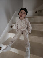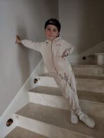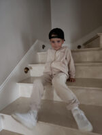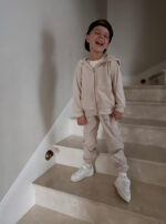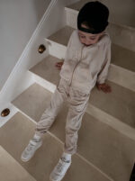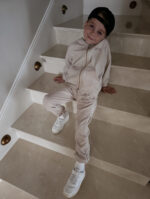 Komplet stworzony z myślą o naszych najmłodszych. Składa się z bluzy zapinanej na suwak z długim rękawem z kapturem oraz długich spodni. Wykonany z prążkowanego materiału welurowego. Na lewej stronie bluzy logowany napis BY ME.