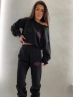 Komplet Essential składający się z bluzy o luźnym kroju, z długim rękawem oraz haftem na boku. Spodnie posiadają haft, gumki na nogawkach i w pasie oraz dwie wbudowane kieszenie.