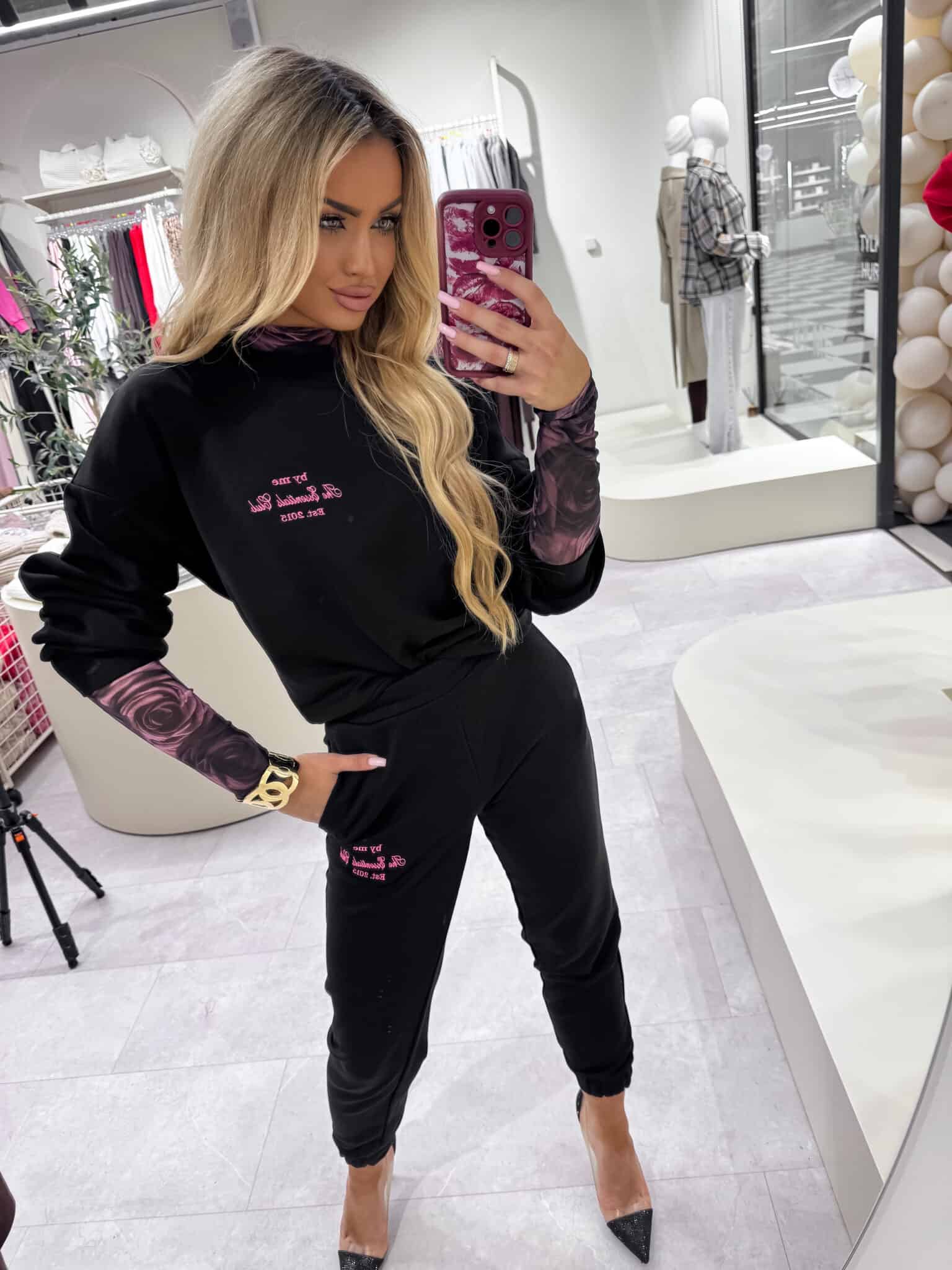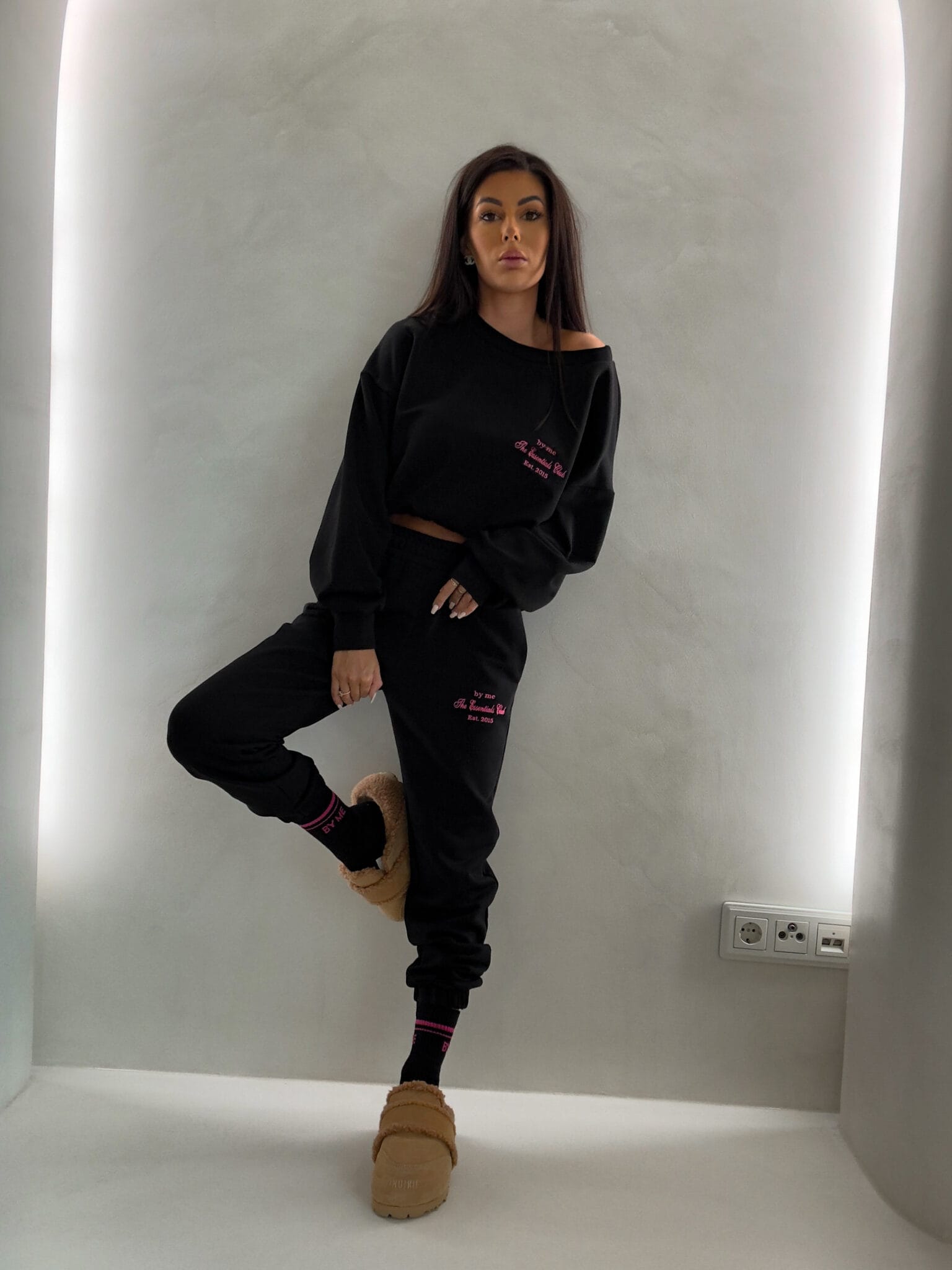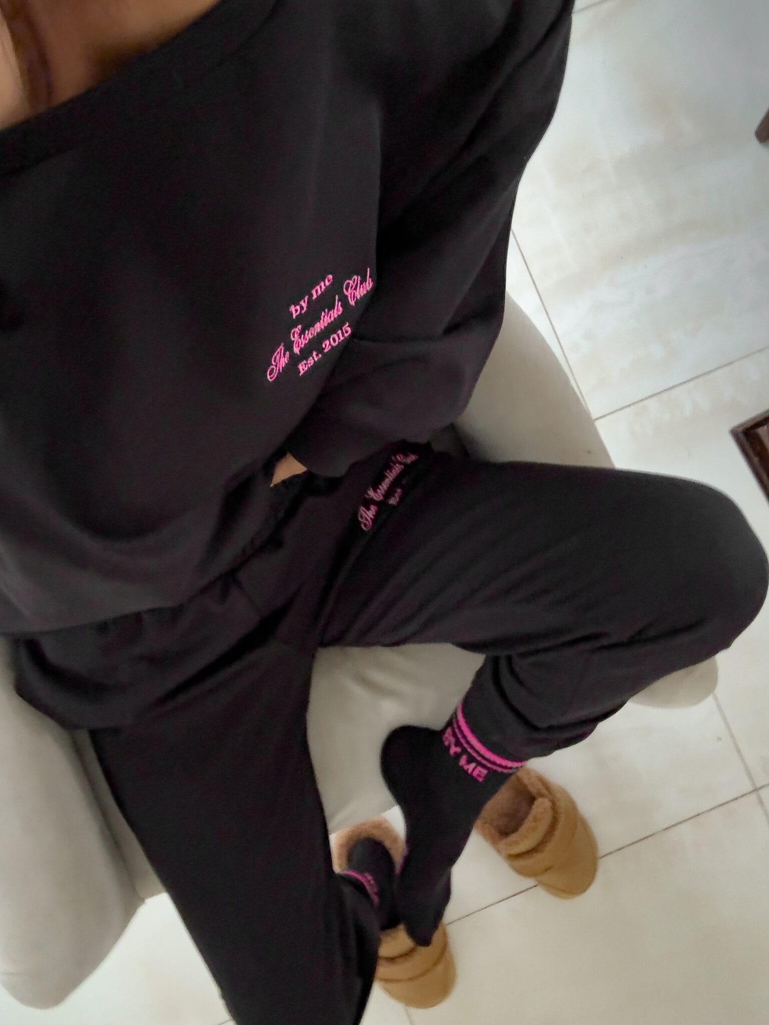 Komplet Essential składający się z bluzy o luźnym kroju, z długim rękawem oraz haftem na boku. Spodnie posiadają haft, gumki na nogawkach i w pasie oraz dwie wbudowane kieszenie.