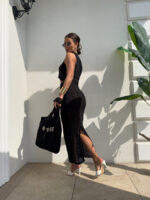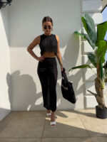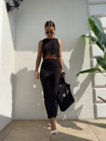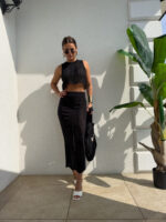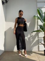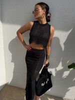 Komplet top ażurowy i spódnica z rozcięciem to idealna propozycja na letnie dni, łącząca elegancję i wygodę. Top wykonany jest z delikatnego, ażurowego materiału, który zapewnia przewiewność i lekkość. Spódnica maxi ma długość sięgającą do ziemi, z rozcięciem, które dodaje jej zmysłowości i lekkości. Gumka w pasie zapewnia wygodne dopasowanie i komfort noszenia. To doskonały wybór na wieczorne wyjścia, wakacyjne spacery czy spotkania z przyjaciółmi.
