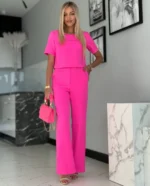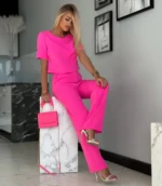 Bluzka z rozszerzanymi spodniami to doskonałe połączenie wygody i elegancji, idealne na letnie dni i wieczory.