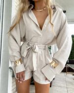 Stylowy komplet składający się z eleganckiej, zapinanej na guziki koszuli oraz dopasowanych spodenek. Koszula zachwyca klasycznym krojem. Spodenki zostały wyposażone w praktyczne szlufki oraz dołączony pasek, który podkreśla talię i dopełnia stylizację. Idealna propozycja na letnie wyjścia, spotkania z przyjaciółmi lub eleganckie okazje w cieplejsze dni.