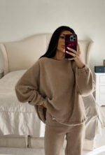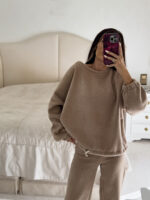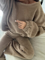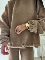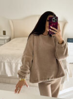 Komplet Jacob’s składa się z wiązanej bluzy i spodni z rozszerzaną nogawką. Materiał jest delikatny i miły w dotyku.