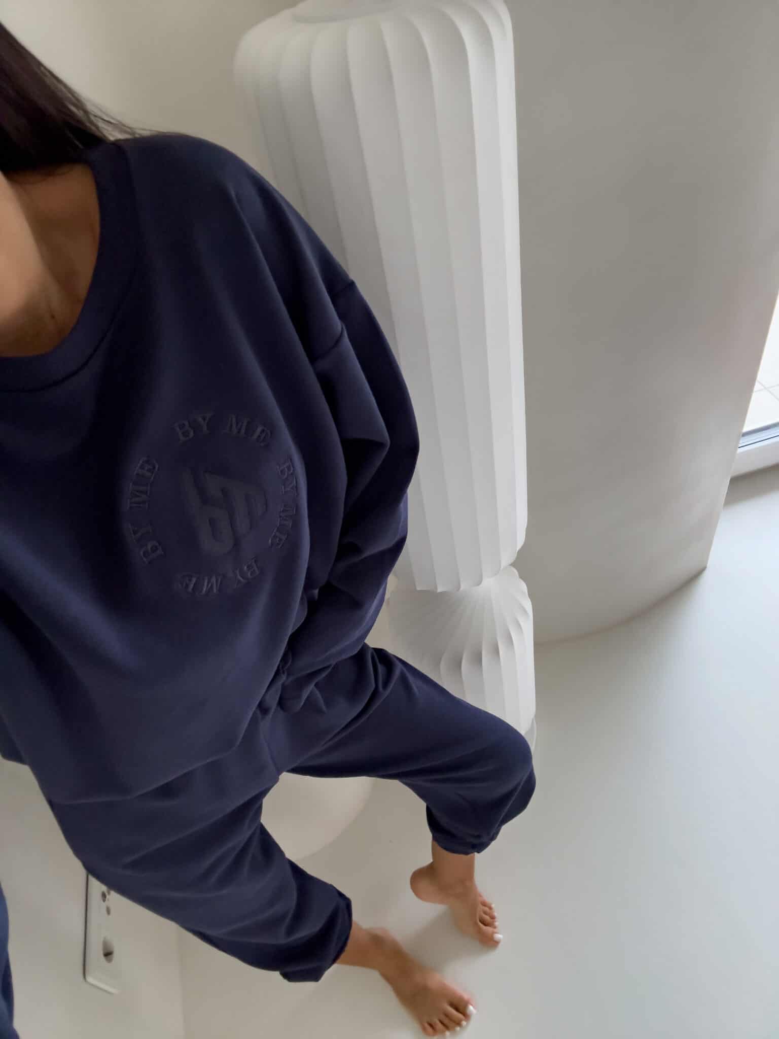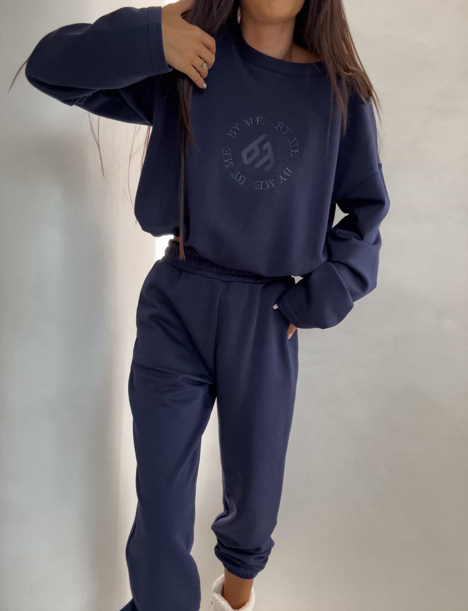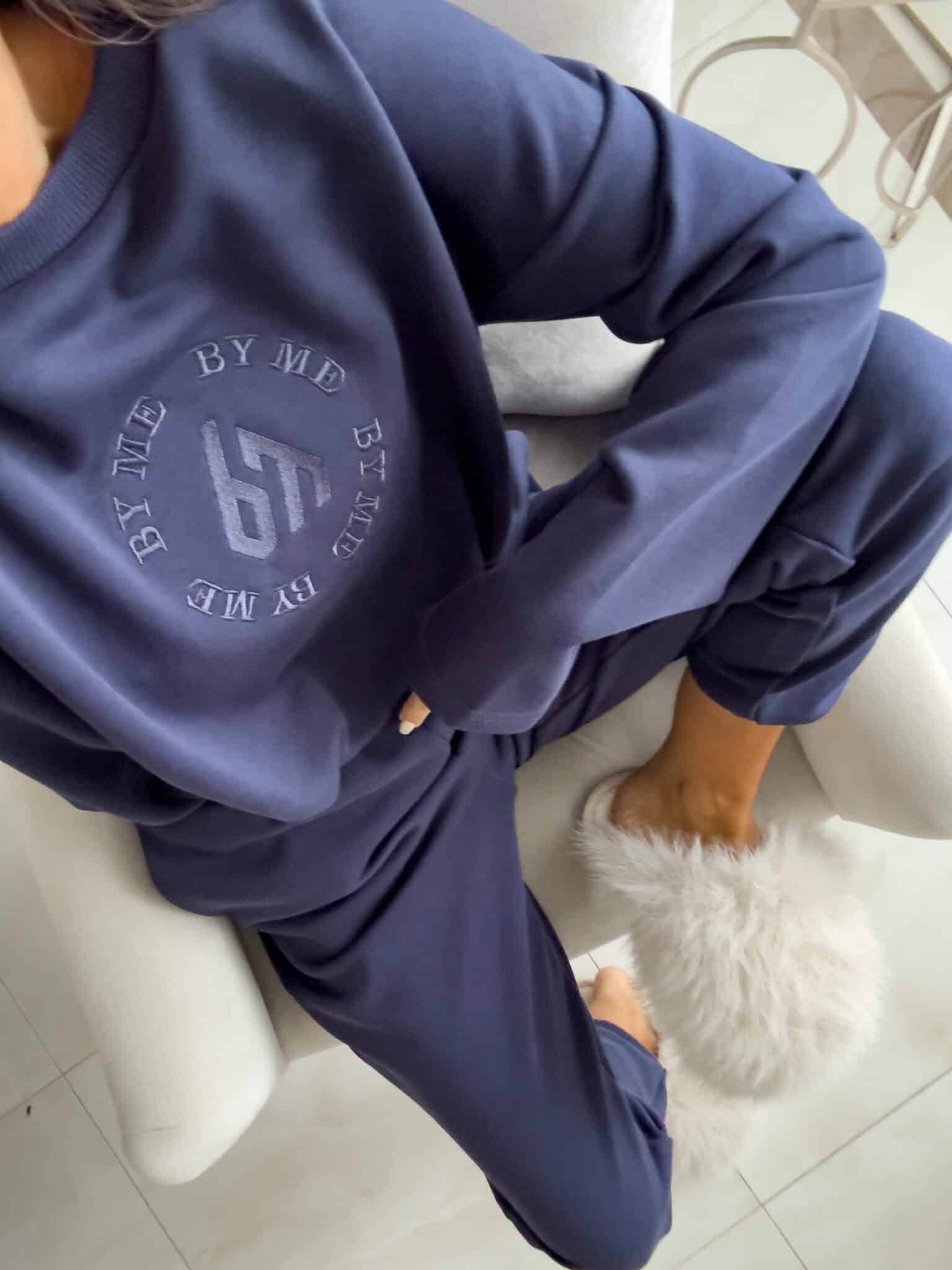 Komplet Louis składający się z bluzy o luźnym kroju, z długim rękawem z troczkiem regulującym długość oraz logowaniem na środku. Spodnie mają gumki na nogawkach i w pasie oraz dwie wbudowane kieszenie.