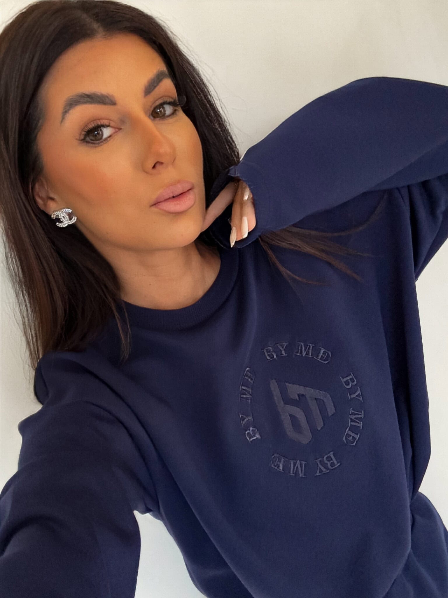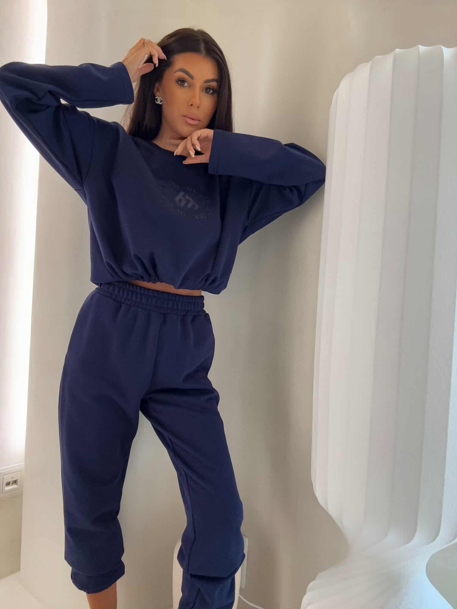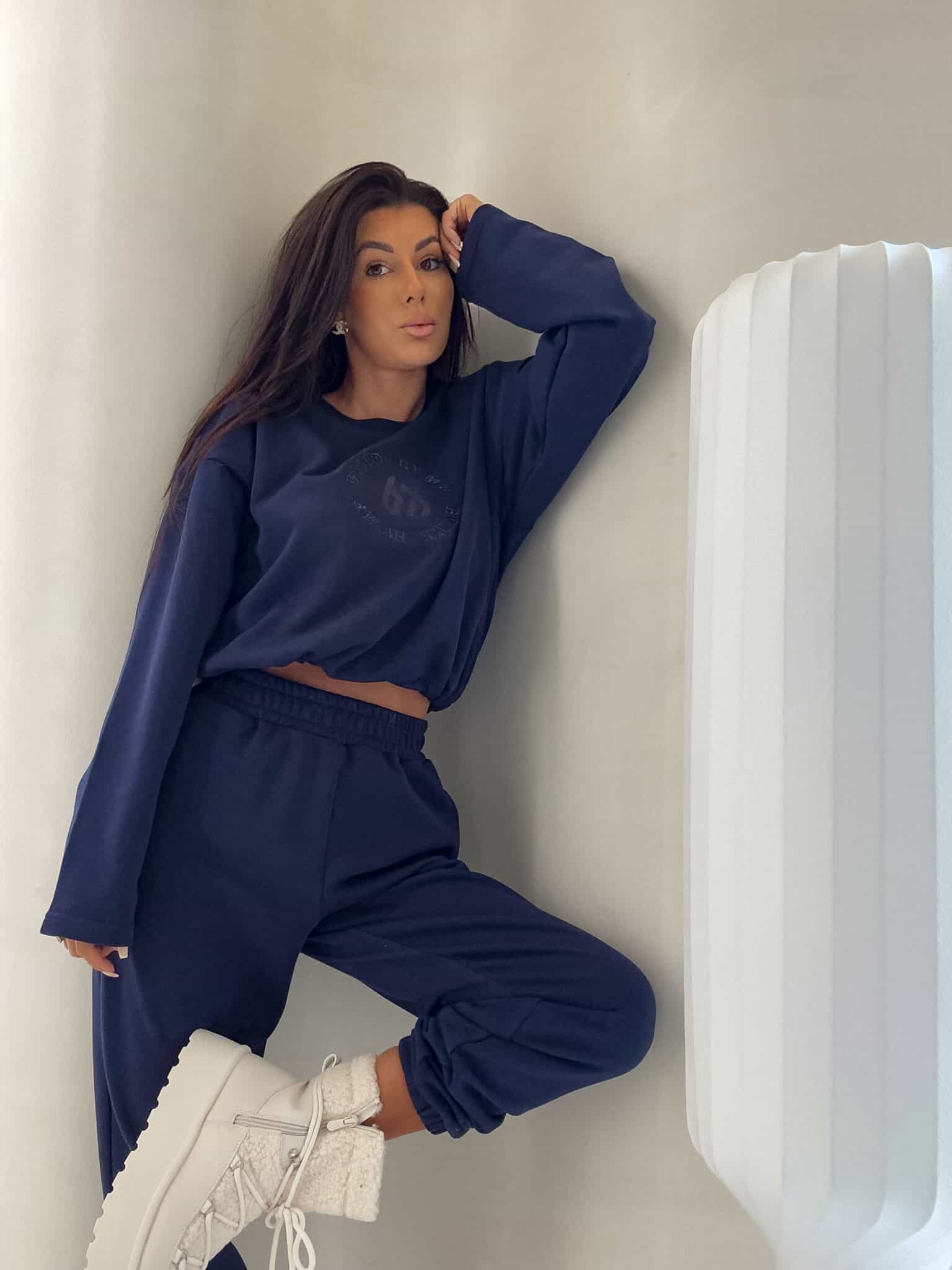 Komplet Louis składający się z bluzy o luźnym kroju, z długim rękawem z troczkiem regulującym długość oraz logowaniem na środku. Spodnie mają gumki na nogawkach i w pasie oraz dwie wbudowane kieszenie.