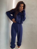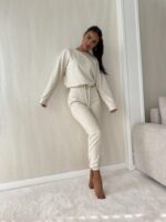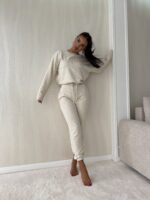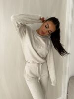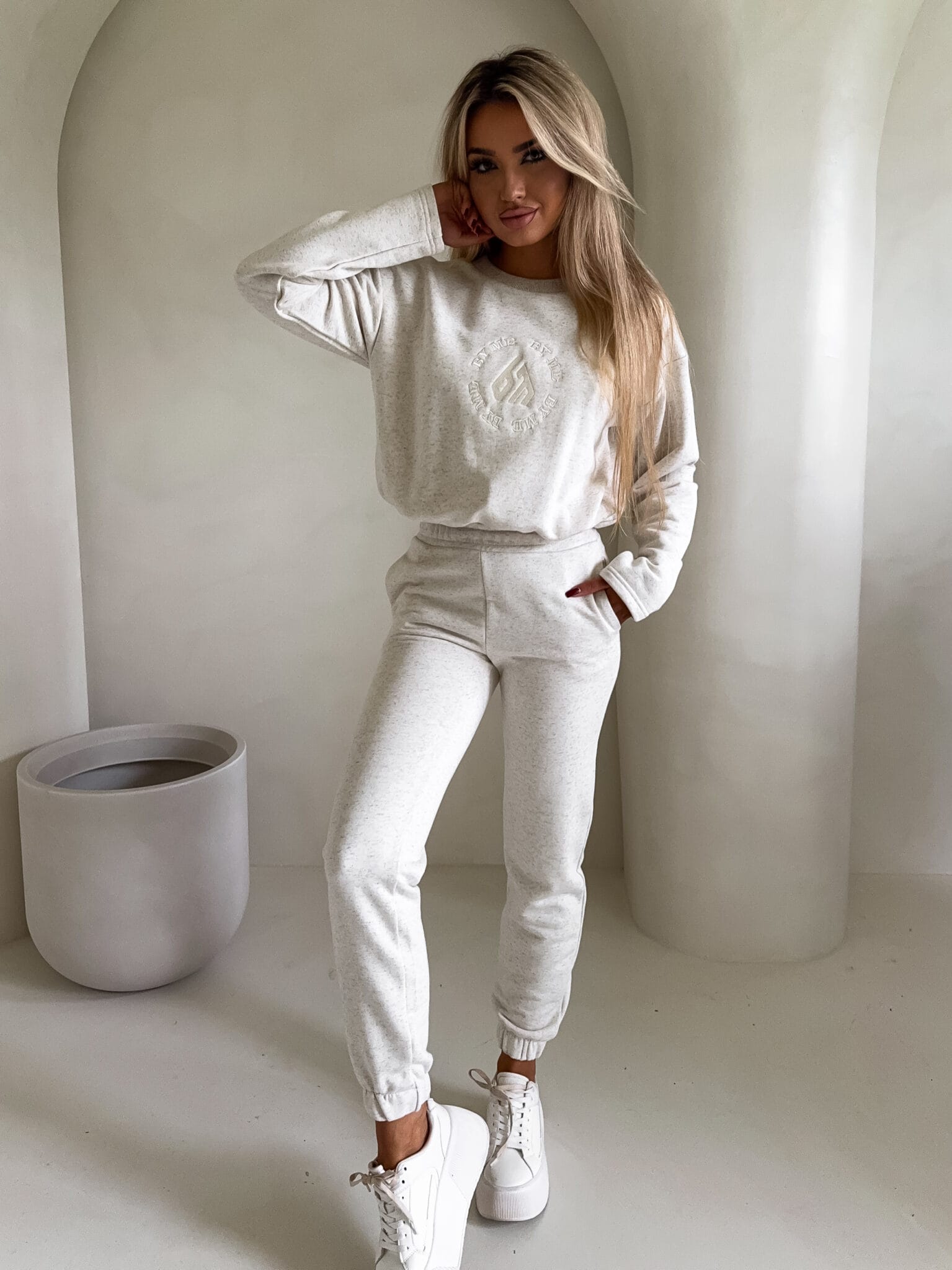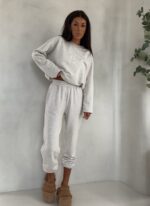Komplet Louis składający się z bluzy o luźnym kroju, z długim rękawem z troczkiem regulującym długość oraz logowaniem na środku. Spodnie mają gumki na nogawkach i w pasie oraz dwie wbudowane kieszenie.