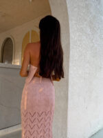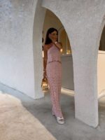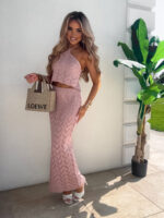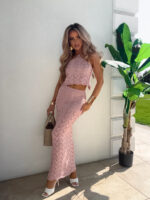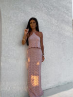 Komplet składający się z topu wiązanego na szyi i na plecach oraz spódnicy maxi z gumką w pasie to elegancka i jednocześnie komfortowa propozycja na letnie dni. Top wiązany na szyi i plecach dodaje lekkości i swobody, zapewniając idealne dopasowanie do sylwetki. Dzięki wiązaniu na plecach i szyi, można dostosować go do swoich preferencji, uzyskując perfekcyjny wygląd. Spódnica maxi z gumką w pasie jest nie tylko wygodna, ale i stylowa – jej luźny krój podkreśla kobiecą figurę, jednocześnie zapewniając komfort noszenia przez cały dzień. To połączenie, które idealnie sprawdzi się zarówno na wakacyjne wyjazdy, jak i na codzienne, letnie stylizacje.