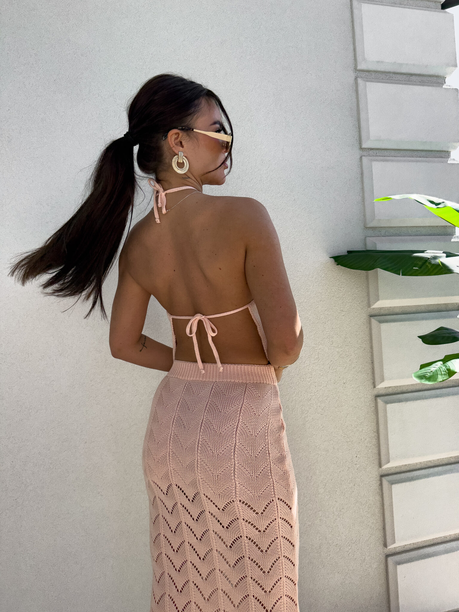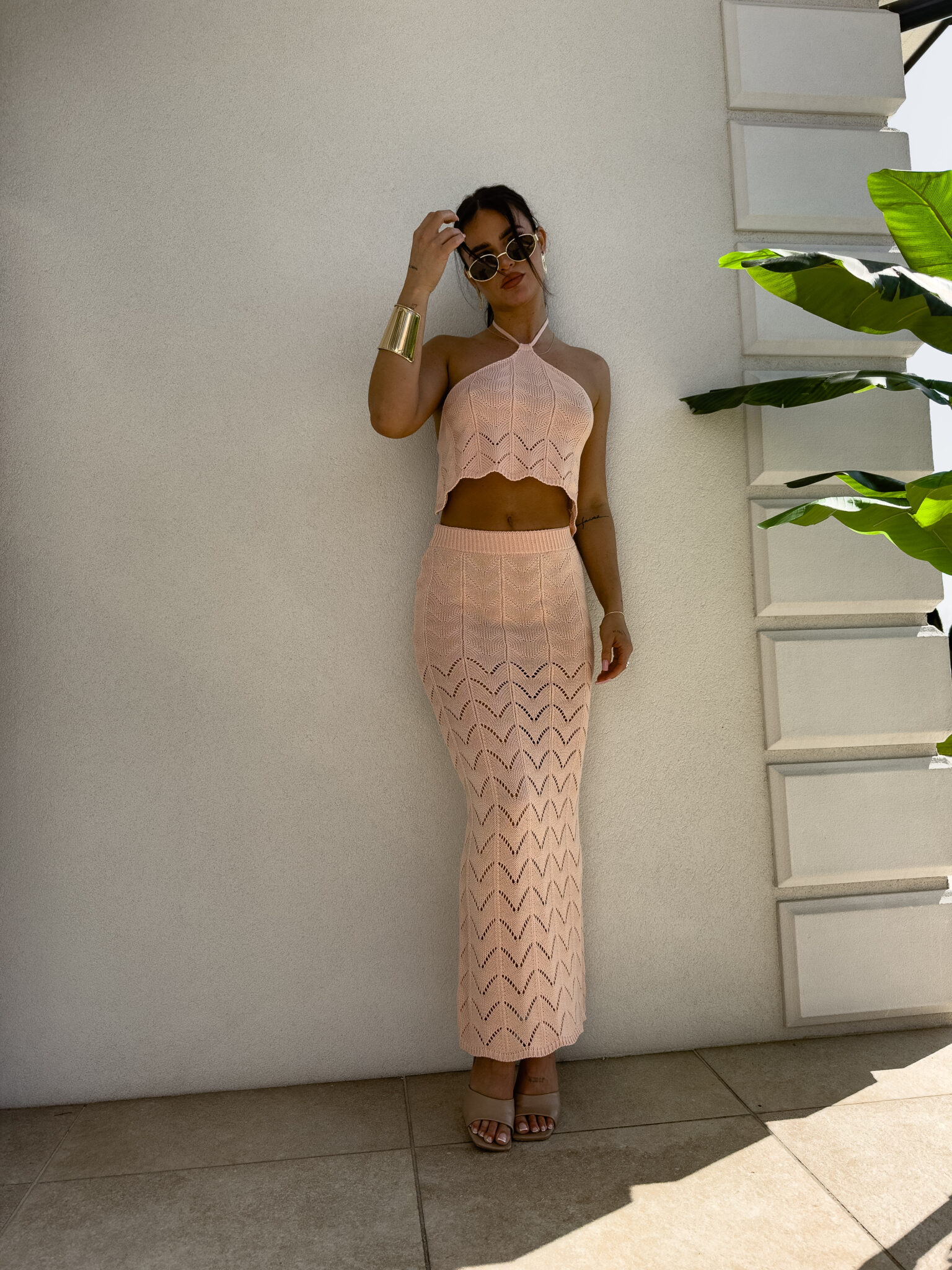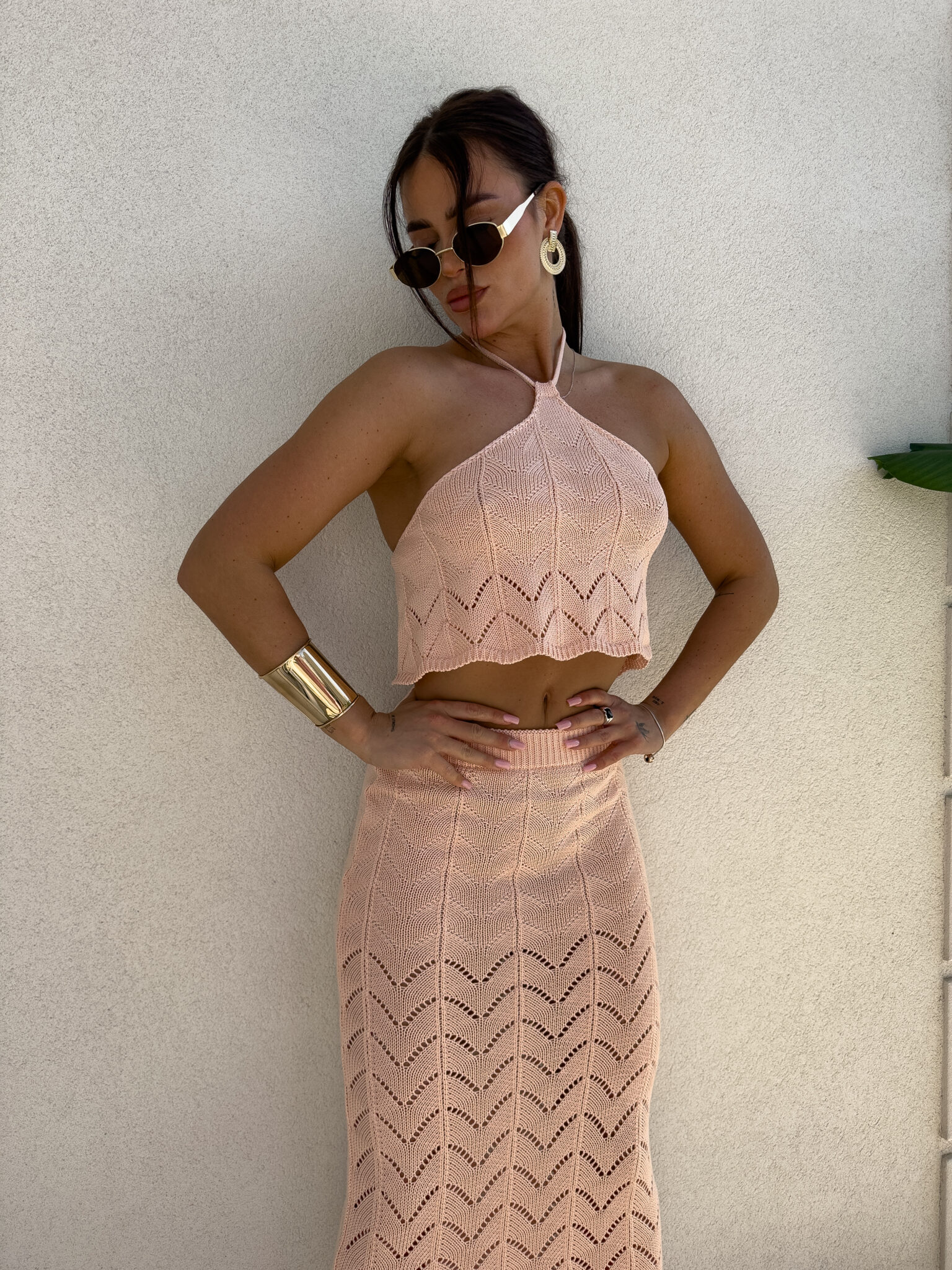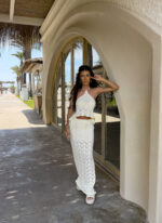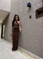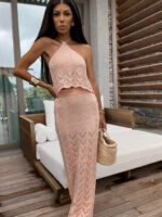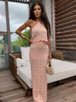 Komplet składający się z topu wiązanego na szyi i na plecach oraz spódnicy maxi z gumką w pasie to elegancka i jednocześnie komfortowa propozycja na letnie dni. Top wiązany na szyi i plecach dodaje lekkości i swobody, zapewniając idealne dopasowanie do sylwetki. Dzięki wiązaniu na plecach i szyi, można dostosować go do swoich preferencji, uzyskując perfekcyjny wygląd. Spódnica maxi z gumką w pasie jest nie tylko wygodna, ale i stylowa – jej luźny krój podkreśla kobiecą figurę, jednocześnie zapewniając komfort noszenia przez cały dzień. To połączenie, które idealnie sprawdzi się zarówno na wakacyjne wyjazdy, jak i na codzienne, letnie stylizacje.