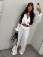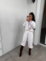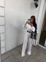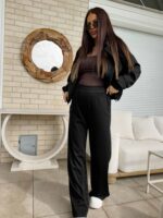 Spodnie dresowe z wysokim stanem i szeroką gumką w pasie zapewniają idealne dopasowanie i komfort noszenia. Proste, lekko rozszerzane nogawki nadają całości swobodny, nonszalancki look.