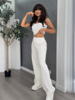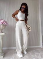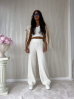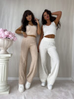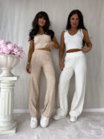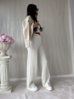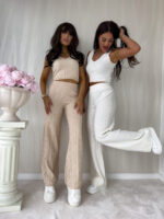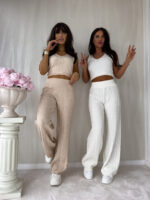 Komplet sweterkowy dzianinowy składający się z topu i spodni z szeroką nogawką. Wykonane z miękkiej dzianiny, zapewniają komfort i wygodę. Cechą wyróżniającą tego kompletu jest luźny, swobodny charakter.