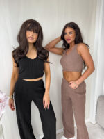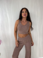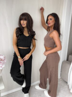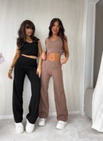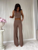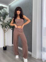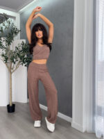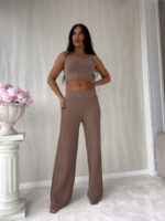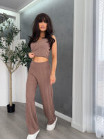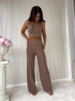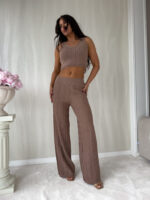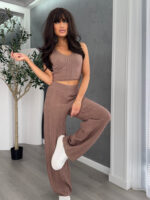 Komplet sweterkowy dzianinowy składający się z topu i spodni z szeroką nogawką. Wykonane z miękkiej dzianiny, zapewniają komfort i wygodę. Cechą wyróżniającą tego kompletu jest luźny, swobodny charakter.
