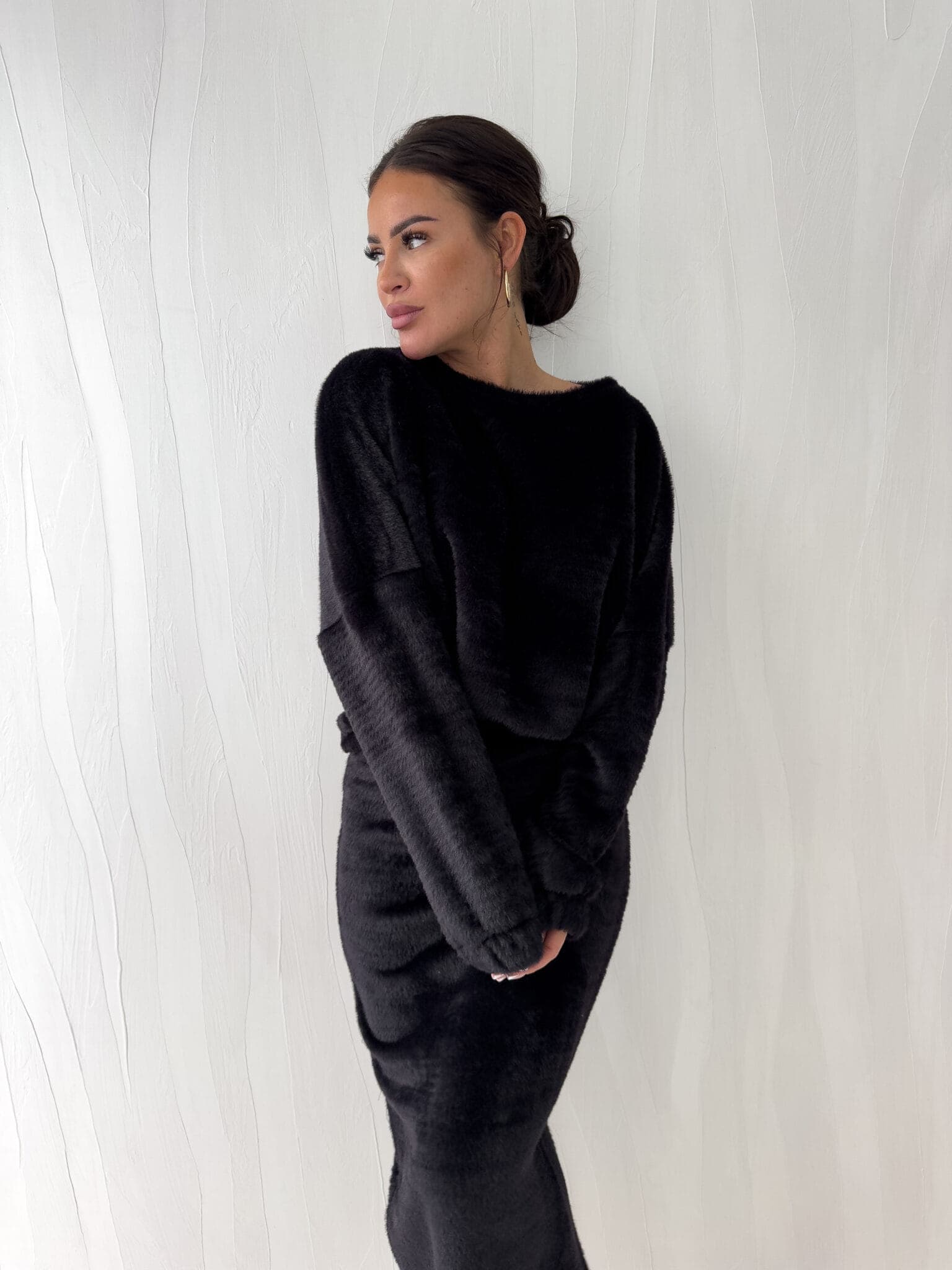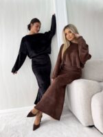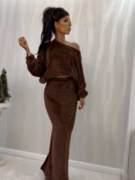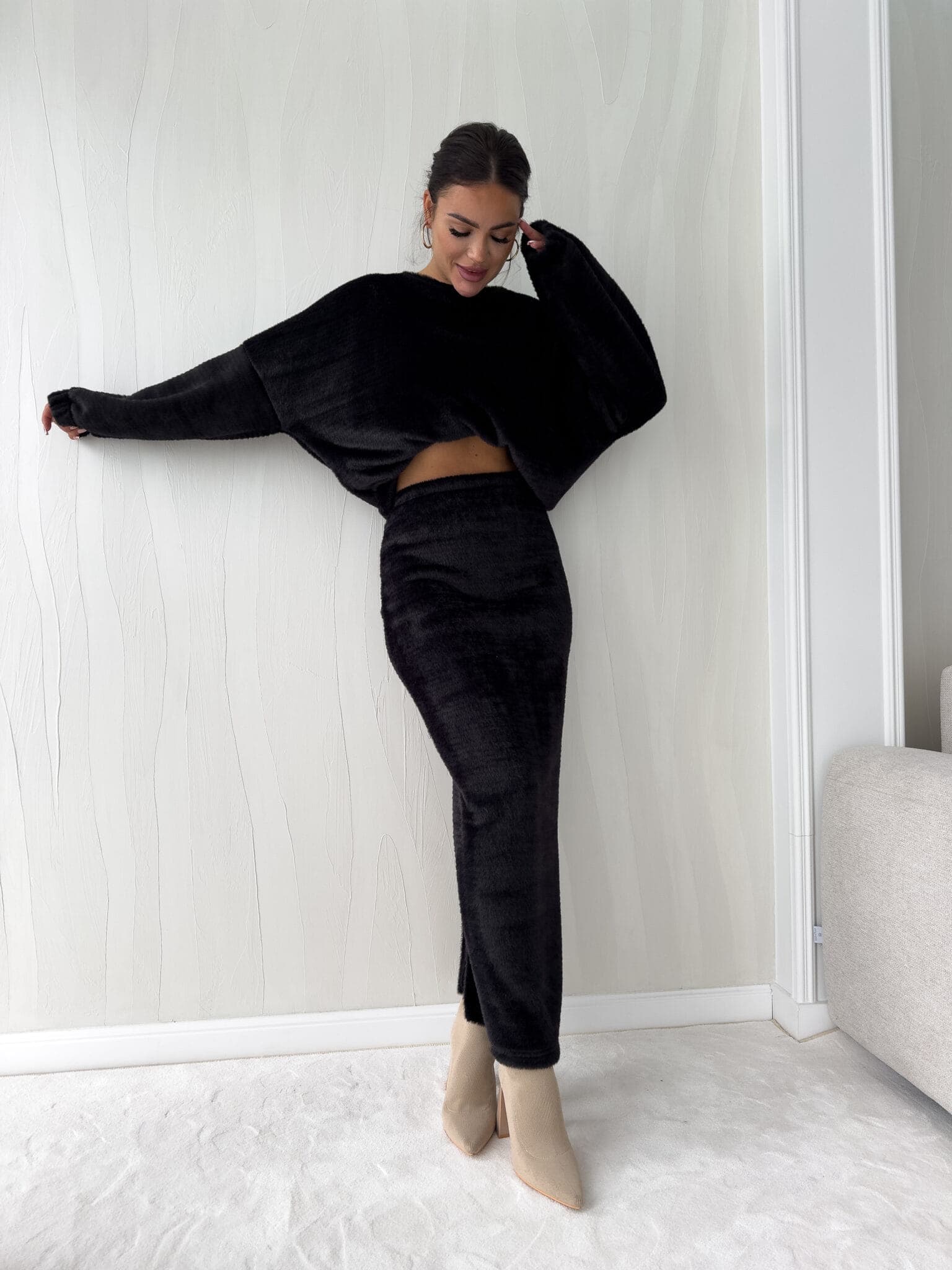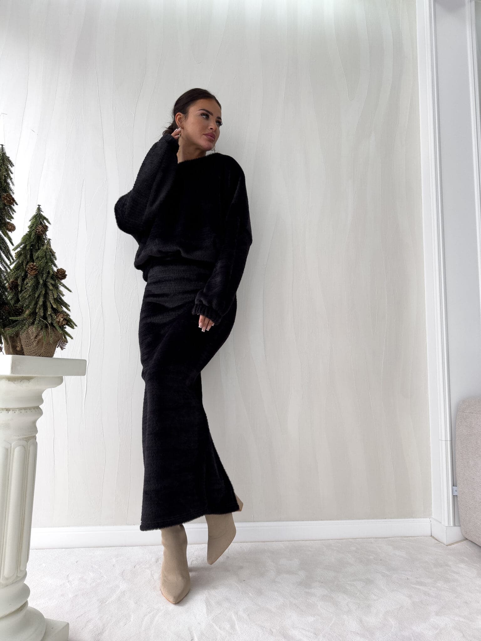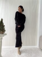 Komplet Winter składa się z wiązanego sweterka i spódnicy maxi z rozporkiem z tyłu. Materiał jest ciągliwy, bardzo delikatny i miły w dotyku.