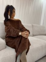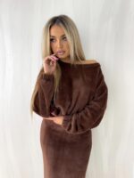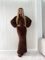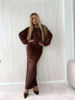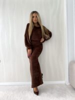 Komplet Winter składa się z wiązanego sweterka i spódnicy maxi z rozporkiem z tyłu. Materiał jest ciągliwy, bardzo delikatny i miły w dotyku.