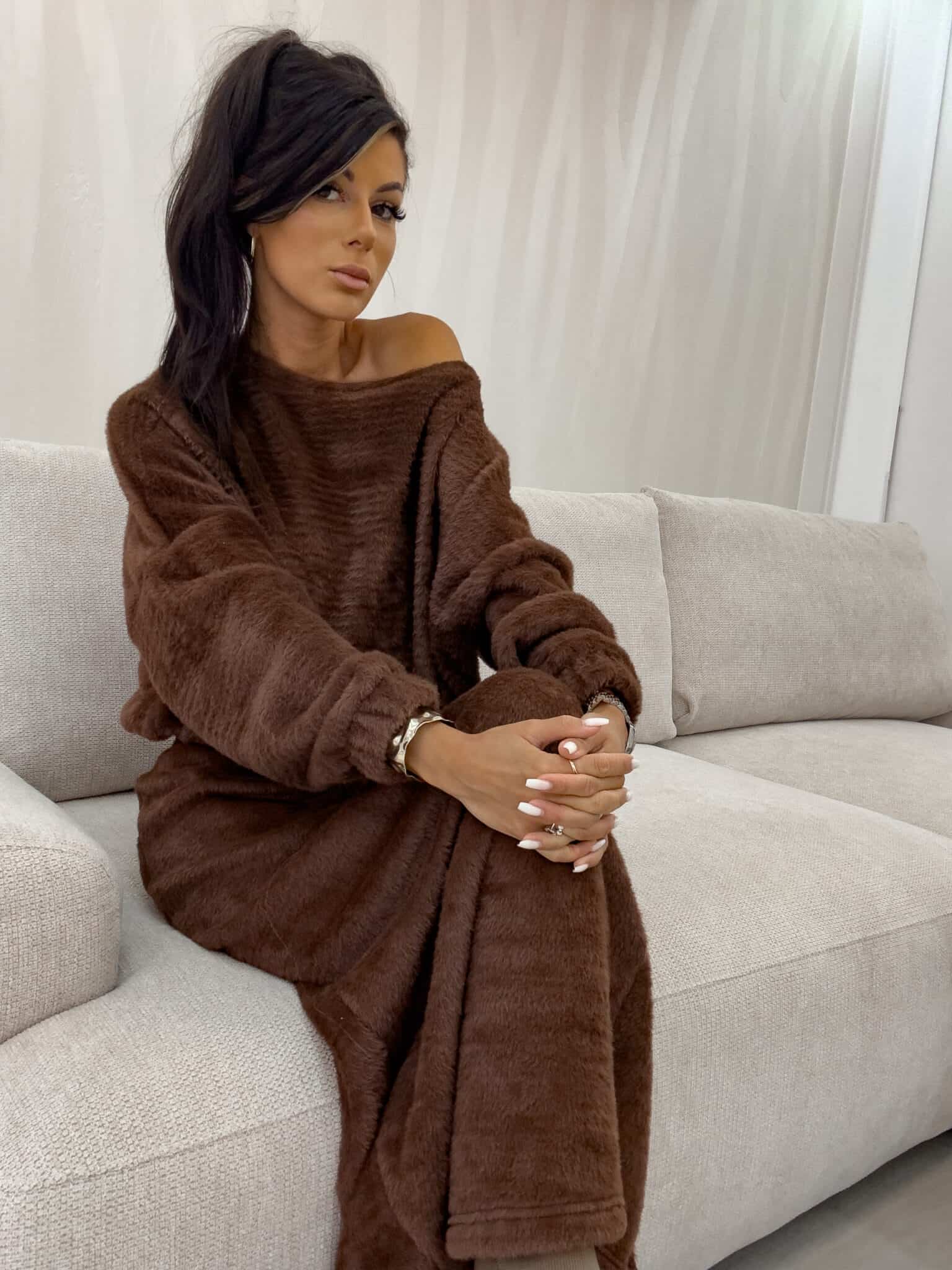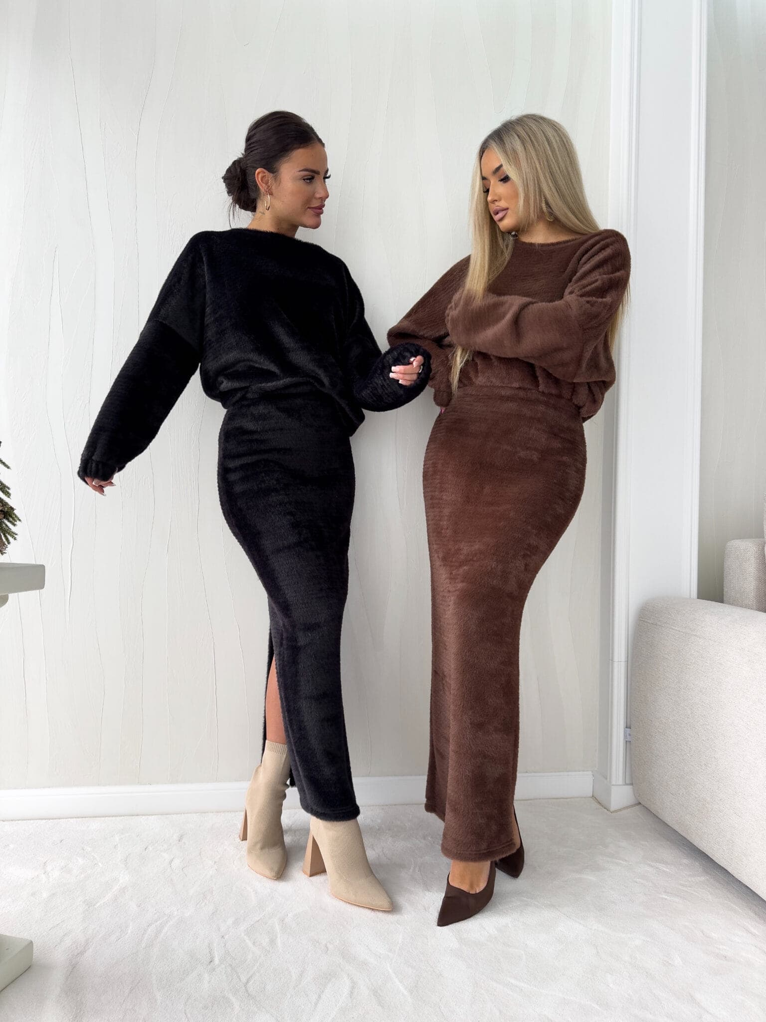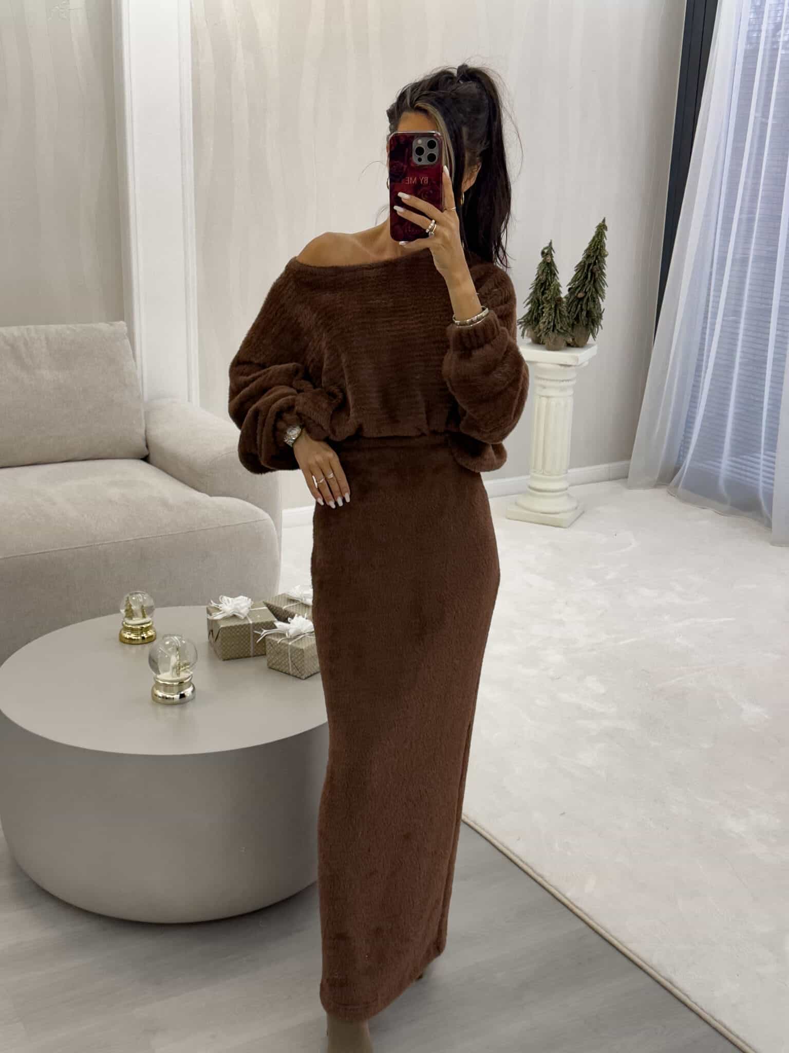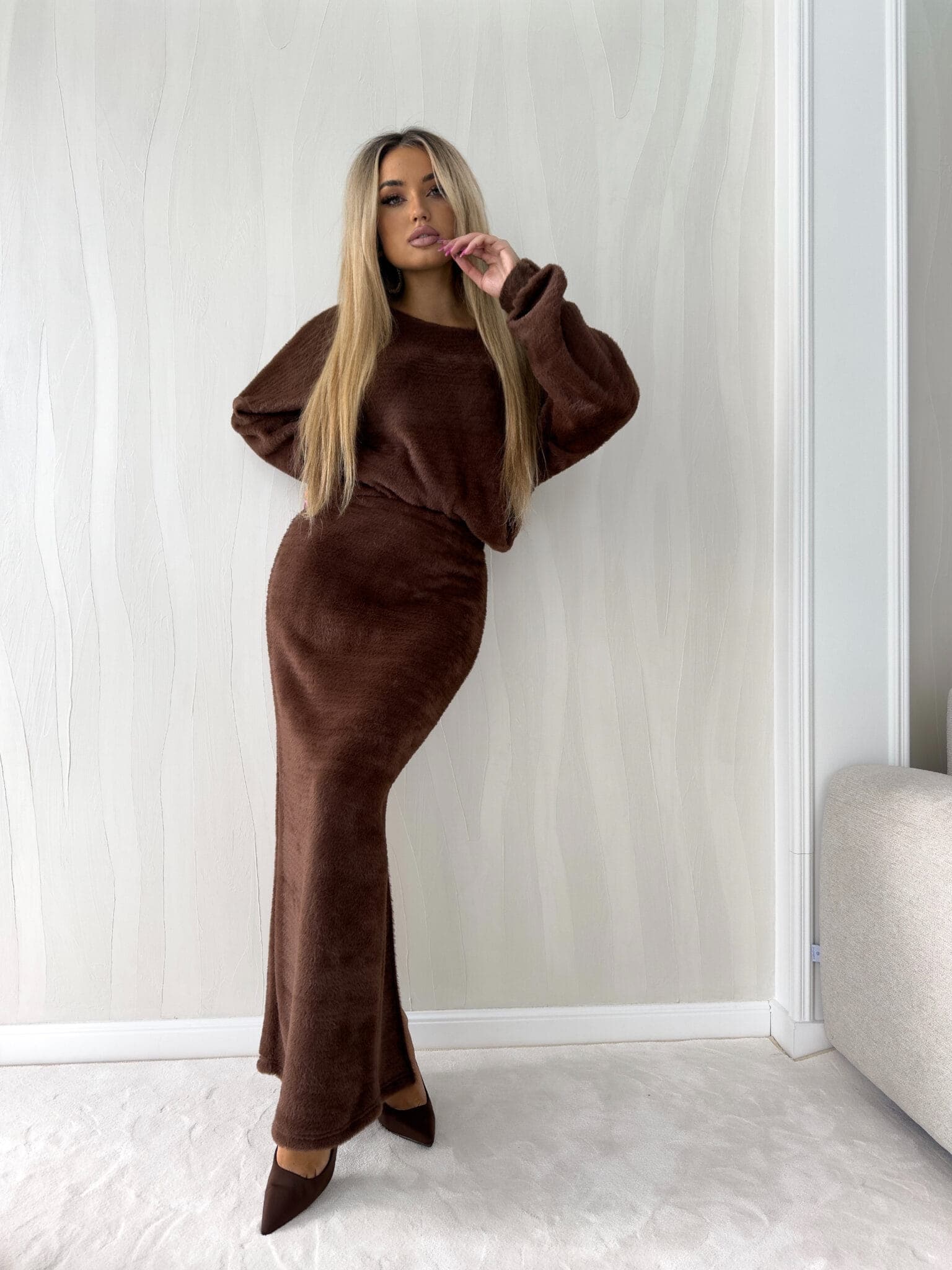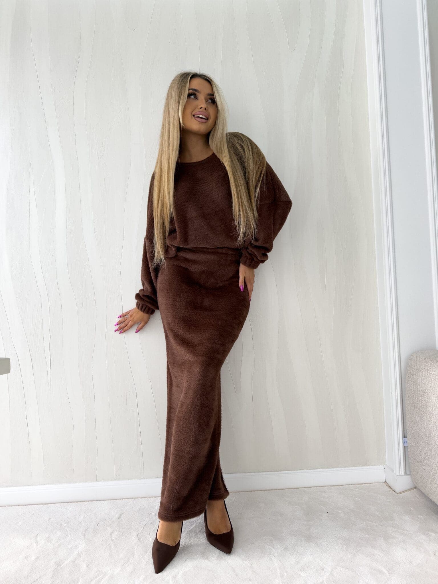 Komplet Winter składa się z wiązanego sweterka i spódnicy maxi z rozporkiem z tyłu. Materiał jest ciągliwy, bardzo delikatny i miły w dotyku.