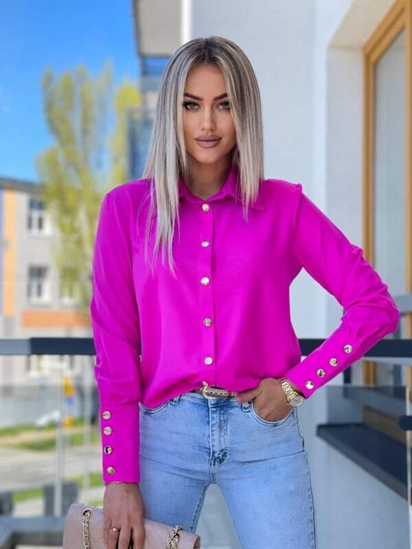 Ta Koszula posiada kołnierzyk oraz mankiety zapinane na ozdobne guziki.