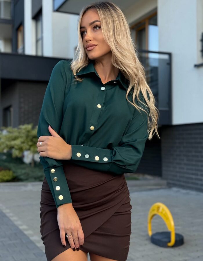 Ta Koszula posiada kołnierzyk oraz mankiety zapinane na ozdobne guziki.