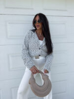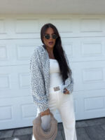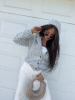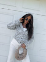 Stylowa i przytulna krótka kurtka wykonana z wyjątkowo miękkiego, puszystego materiału. Zapinana na guziki, doskonale dopasowuje się do sylwetki, zapewniając maksymalny komfort noszenia. Dodatkowym atutem jest praktyczny kaptur, który chroni przed chłodem i wiatrem. Idealna na chłodniejsze dni.