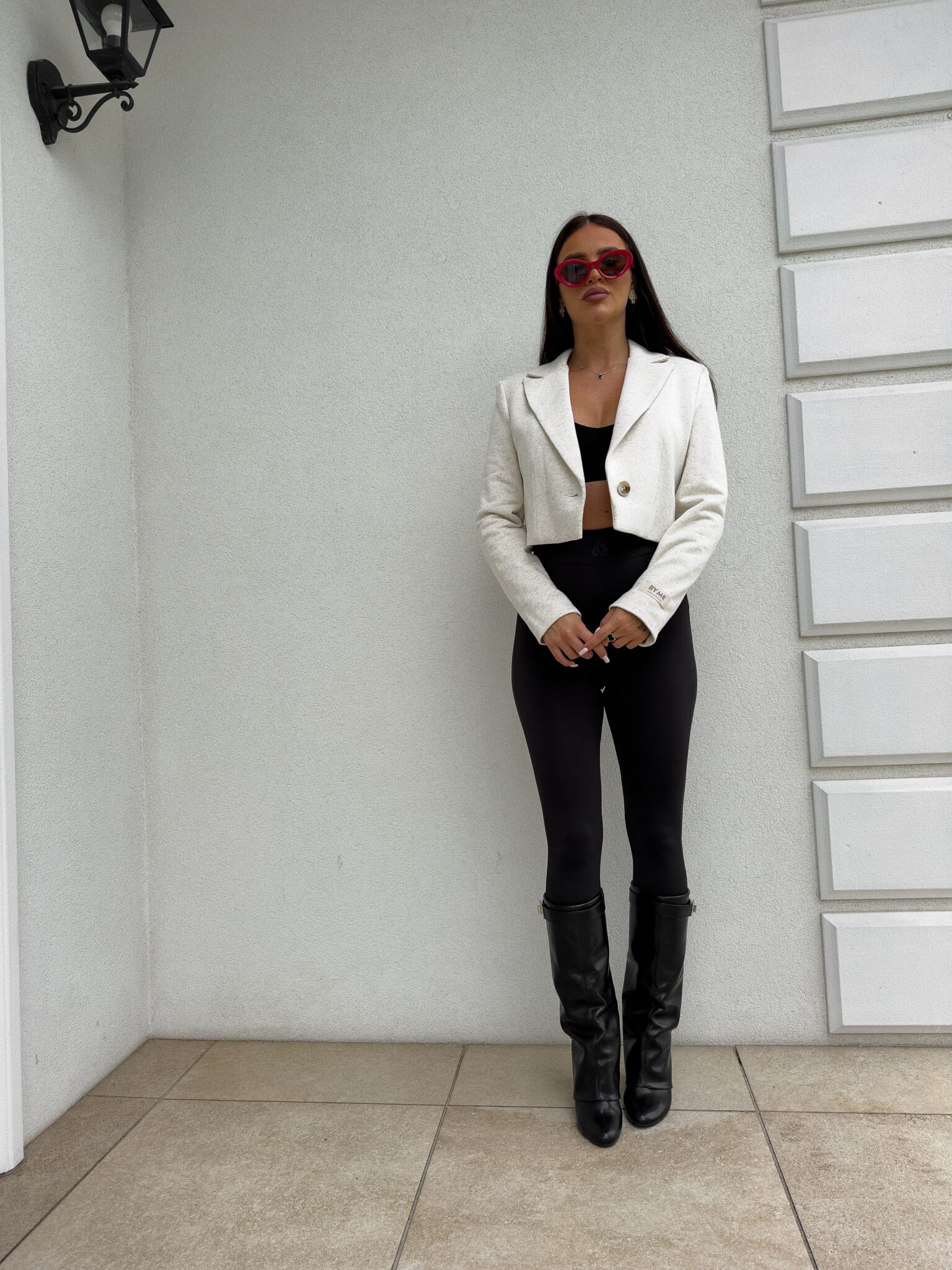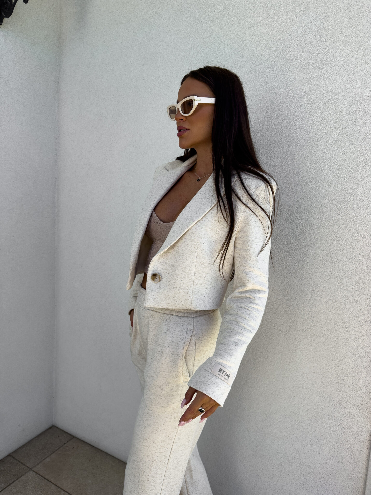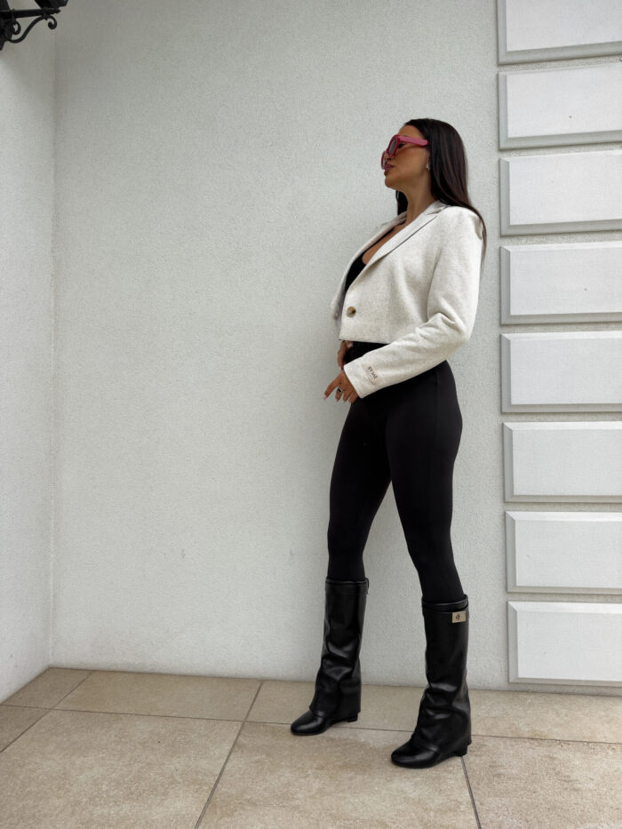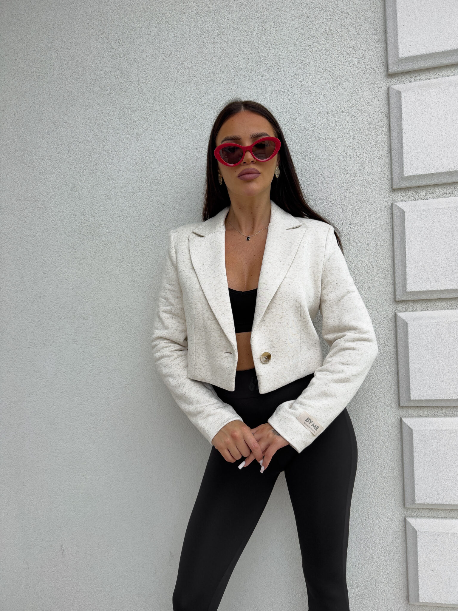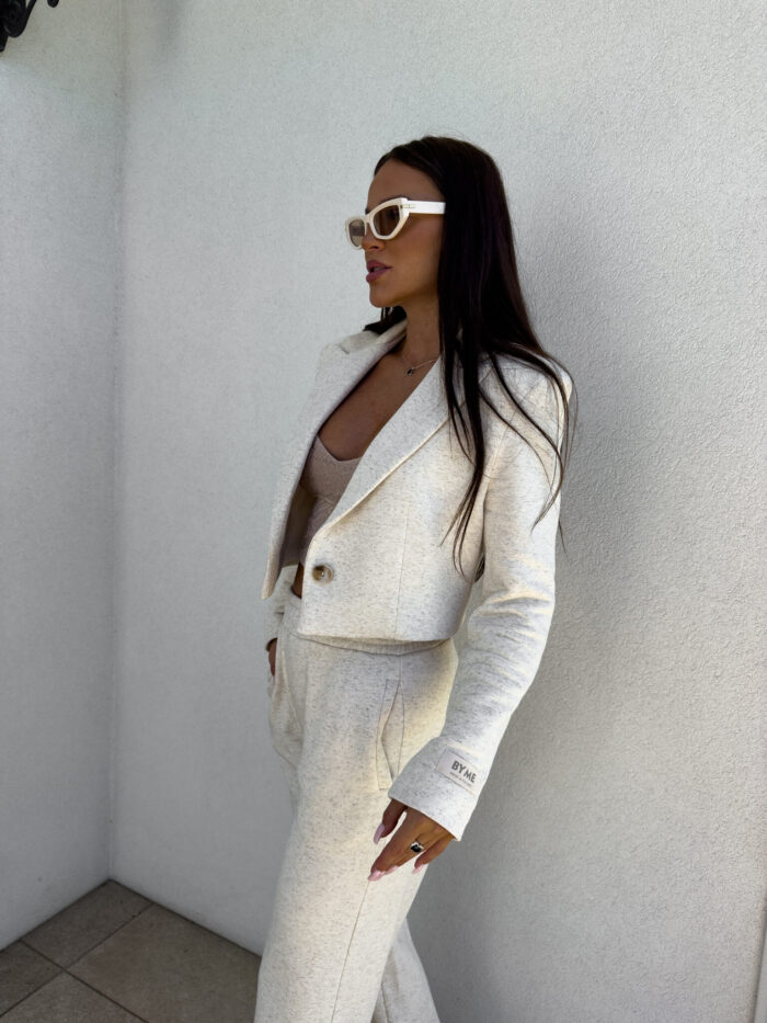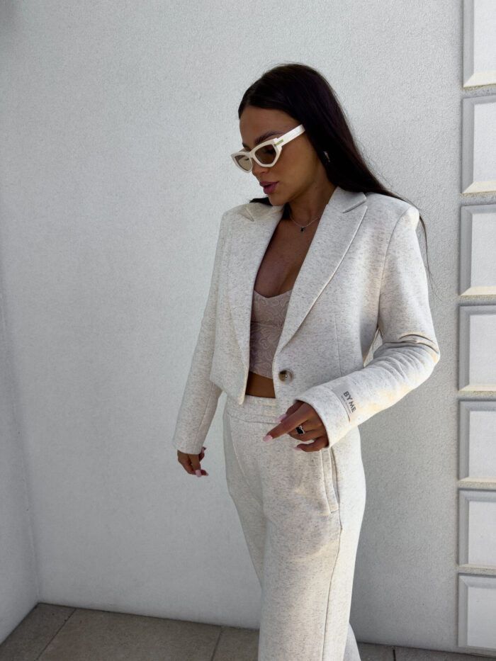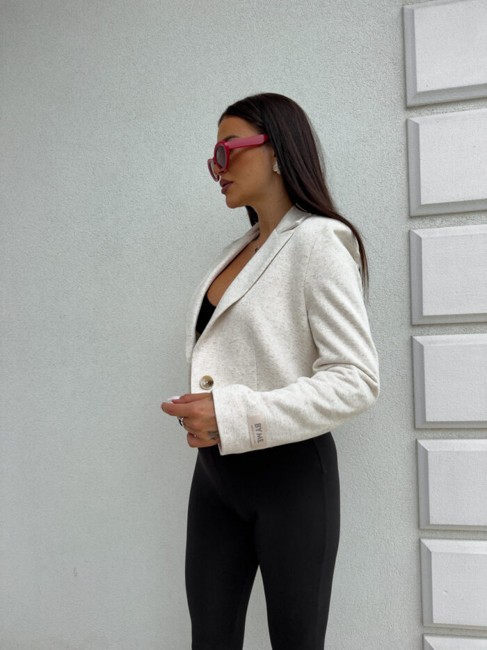 Marynarka o krótkim kroju, gładkie wykończenie. Marynarka posiada podszewkę, zapięcie regulowane przy pomocy guzika.