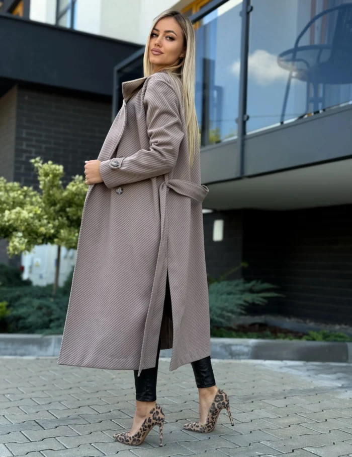 Długi płaszcz o ponadczasowym fasonie, który sprawia, że elegancja staje się nieodłącznym elementem codzienności. Model jest lekko oversizowy przez co wygodny w codziennym noszeniu, posiada rozcięcia po bokach na dole oraz kieszenie. Idealne dopełnienie dla każdej kobiety, która ceni sobie subtelne, lecz wyraziste akcenty w swojej garderobie.