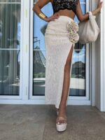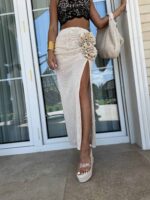 Zachwycająca spódnica Malibu to połączenie kobiecości i wakacyjnego luzu. Model wyróżnia się efektownym rozcięciem, które subtelnie odsłania nogę, dodając stylizacji lekkości i zmysłowości. Uroku dodają piękne kwiaty, które są na stałe przymocowane do materiału – to detal, który przyciąga spojrzenia i sprawia, że spódnica nabiera wyjątkowego charakteru.
