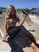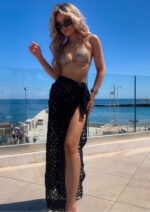 Stylowa i kobieca spódnica o długości maxi, wykonana z lekkiego, przewiewnego materiału, idealnego na cieplejsze dni. Subtelna ażurowa struktura dodaje jej unikalnego charakteru i delikatności. Wiązanie pozwala na regulację obwodu i idealne dopasowanie do sylwetki, a jednocześnie podkreśla talię.