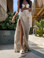 Stylowa i kobieca spódnica o długości maxi, wykonana z lekkiego, przewiewnego materiału, idealnego na cieplejsze dni. Subtelna ażurowa struktura dodaje jej unikalnego charakteru i delikatności. Wiązanie pozwala na regulację obwodu i idealne dopasowanie do sylwetki, a jednocześnie podkreśla talię.