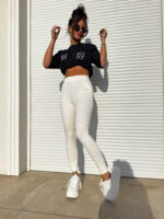 Spodnie Midas mają wysoki stan, który pięknie modeluje sylwetkę. Gumka w pasie oraz kieszenie. Posiadają efektowne przeszycia.