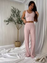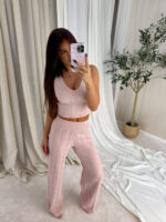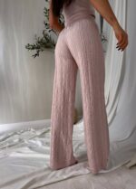 Spodnie sweterkowe dzianinowe z szeroką nogawką to wygodna i modna propozycja na co dzień. Wykonane z miękkiej dzianiny, zapewniają komfort i wygodę. Cechą wyróżniającą tych spodni jest szeroka nogawka, która nadaje im luźny, swobodny charakter, a jednocześnie zapewnia swobodę ruchów. Ciekawy splot materiału dodaje im oryginalności, tworząc subtelną, teksturalną strukturę, która przyciąga wzrok. Spodnie te świetnie komponują się z prostymi topami, swetrami lub kurtkami, tworząc casualowy, ale elegancki look.