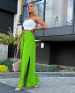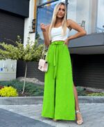 Przepiękne letnie spodnie z rozcięciami na bokach. Lekkie zwiewne, idealne na każdą figurę. Spodnie są wiązane, regulowane. W środku posiadają guziczek. Polski producent