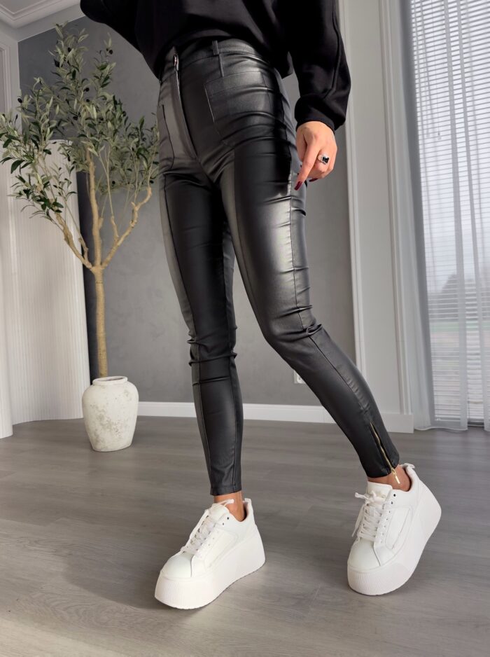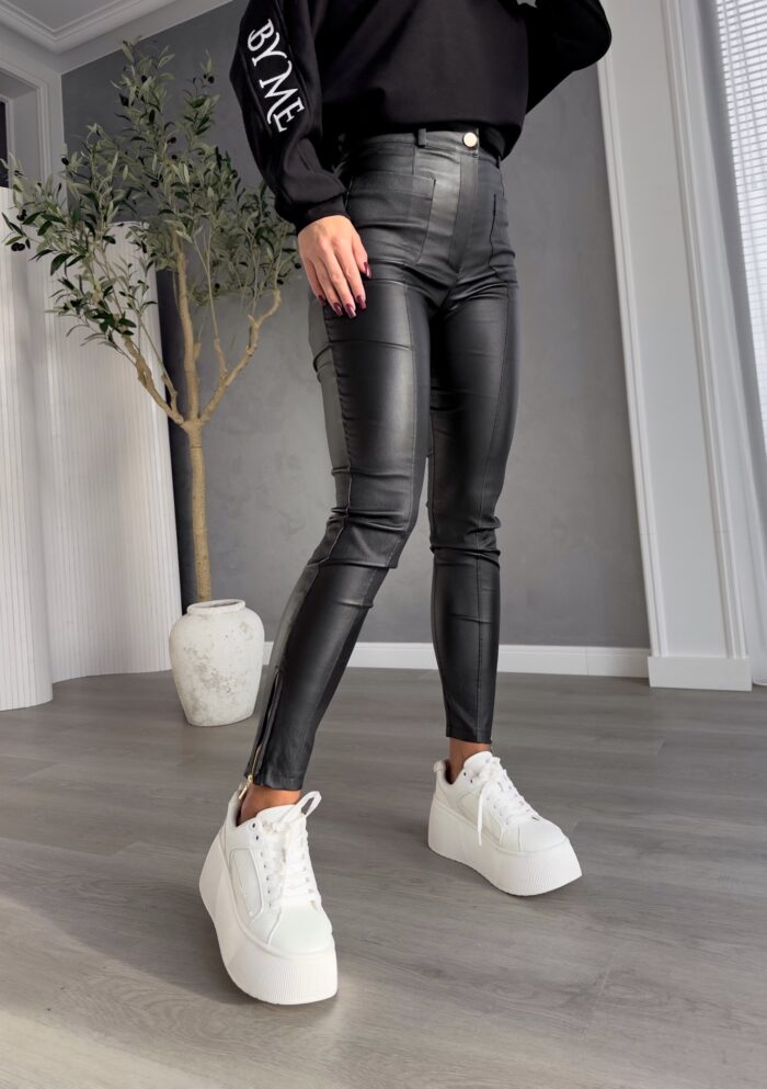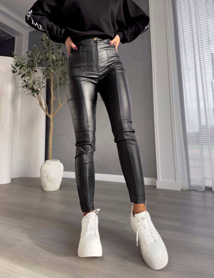 Spodnie POCKET charakteryzują się woskowanym wykończeniem materiału. Zapinane na jedną, złotą napę. Suwaki na nogawkach. Pionowe przeszycia z przodu, dzięki czemu pięknie wydłużają nogi. Na przodzie dwie kieszenie.