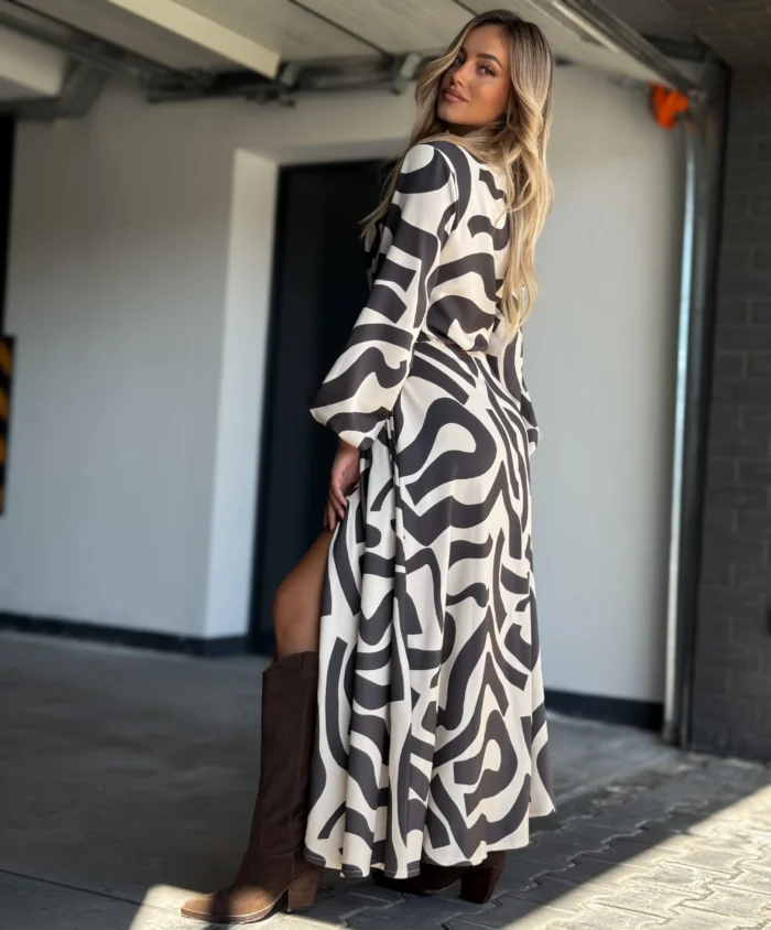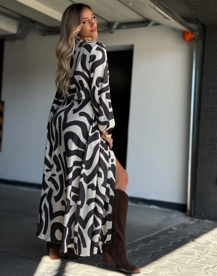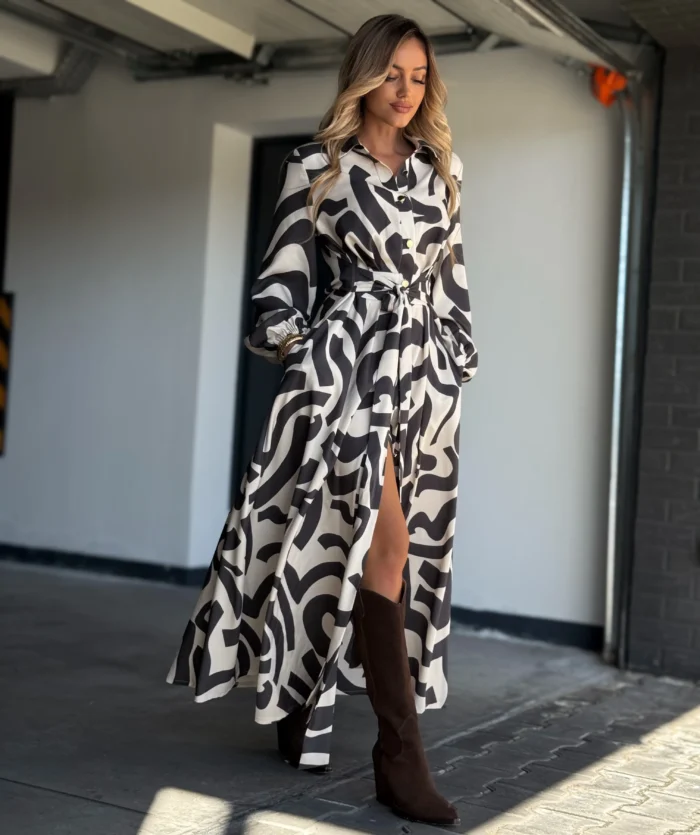 Stylowa midi sukienka z kołnierzykiem. Posiada długie rękawy zakończone gumką, góra sukienki zapinana jest na złote guziki, w pasie przewiązywna paskiem, który pięknie uwydatnia talię. Wykonana z dobrej jakości materiału. Sprawdzi się zarówno na przyjęciach okolicznościowe, jaki i w codziennych wyjściach do pracy.