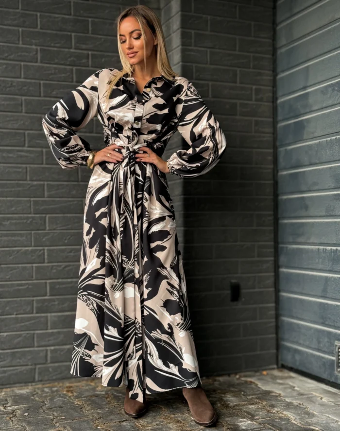 Stylowa midi sukienka z kołnierzykiem. Posiada długie rękawy zakończone gumką, góra sukienki zapinana jest na złote guziki, w pasie przewiązywna paskiem, który pięknie uwydatnia talię. Wykonana z dobrej jakości materiału. Sprawdzi się zarówno na przyjęciach okolicznościowe, jaki i w codziennych wyjściach do pracy.